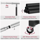 adjustable clothes rack with wheels expandable clothing rack with bottom shelf rolling garment rack for heavy clothes industrial clothing rack with wheels and shelf metal garment rack with wheels for coats clothes rack for small spaces with wheels clothing rack for heavy coats rolling clothes rack for bedroom or living room metal clothing rack for industrial or home use clothes rack with wheels for easy moving and storage modern clothes rack with shoe storage and wheels vintage style garment rack with bottom shelf durable iron clothing rack with bottom storage clothes rack for college dorm with wheels Portable Clothes Rack with Shoe Rack and Wheels Heavy Duty Garment Rack with Extendable Rod 【Practical Product Design】The top horizontal rod of the garment rack can be extended from 31.1 inches to 48.19 inches. The garment rack is small but still has enough storage space. The top of the garment rack has stoppers on both sides, not only prevents clothes from falling off, but also provides a perfect place for hats. The rods at the bottom of the garment rack can storage boxes, it not only gives you more storage space but also makes the garment rack more stable. 【Heavy-Duty Iron Construction】Built with sturdy iron metal, this garment rack is designed to withstand heavy use. It can hold a large capacity of clothing, coats, or accessories without bending or wobbling, ensuring long-lasting durability for both home and industrial use. 【Mobility with Smooth-Rolling Wheels】Equipped with 4 smooth-rolling wheels, this clothing rack is easy to move around your space. Two of the wheels can be locked so that the garment rack can be stopped stably. Whether you're reorganizing your room or need a portable rack for events, the wheels provide effortless mobility and stability on any floor surface. 【Large Capacity & Versatile Use】 With its spacious design and expandable frame, this rack is ideal for holding a large amount of clothing, from everyday outfits to heavy coats. Whether for home organization, retail displays, or event setups, this garment rack is a practical and stylish solution. 【Easy to Install】The product has a detailed installation manual and installation tools attached, meanwhile we have grouped and categorized each part to make it easy that you can find the corresponding parts according to the installation manual. You can also refer to the installation video next to the main picture of the product to install the product.