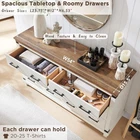 Farmhouse Dresser, 6 Drawers Dresser for Bedroom with Storage, 54" Wide Wood Chest of Drawers w/Natural Texture & Metal Handle, Hallway, Antique White Product Description About this item Ample Storage: The wood dresser features 6 spacious drawers (23.7"W x 12"D x 6.53"H), each equipped with easy-to-grip handles and high-quality slides for smooth, effortless operation. These generously sized drawers provide ample room to store clothes, bedding, and accessories, helping you keep your essentials organized and easily accessible. Say goodbye to clutter and enjoy a tidy, well-organized space with this practical and stylish dresser Farmhouse Dresser: Bring refined farmhouse style to your space with the farmhouse 6 drawers dresser. Measuring 15.5"D x 54"W x 31.25"H, this large dressers for bedroom features a natural wood grain finish enriched by unique weathered textures, adding authentic rustic charm. Hand-burnished metal accents lend a touch of sophistication, while 6 spacious drawers offer generous storage. Designed to be both versatile and elegant, it's a seamless fit for any farmhouse-inspired decor Built for Durability: Our dresser is made from FSC-Certified wood and crafted from high-density engineered wood, the wood dresser offers lasting durability and exceptional stability. The 1.77" thick tabletop supports up to 100 lbs, while the 4.13" sturdy base ensures strong stability. Wall anchors prevent tipping, and optional anti-tip metal plates provide added security (installable based on your preference) Practical Storage for Every Room: The bedroom dresser is designed for ultimate versatility, offering practical storage that fits seamlessly into any space. Whether organizing clothes and bedding in the bedroom, serving as tv stand in the living room, or keeping entryway items neatly tucked away, this dresser drawer organizer adapts to your needs. Its multi-functional design ensures a clutter-free, organized space, adding both convenience and a stylish touch to every corner of your home Buy with Confidence: Your wooden drawer chest dresser will arrive securely packaged with protective foam and wooden boards to prevent any shipping damage. We take every precaution to ensure your item reaches you in perfect condition. Every package includes detailed installation instructions, clearly labeled parts for easy assembly, and a pack of spare hardware for peace of mind. We're here to make your experience smooth and hassle-free!