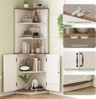 Tall Corner Cabinet, Farmhouse Storage Cabinet with Adjustable Shelves, Freestanding 5-Tier Hutch with Doors, Home Space Saver for Kitchen, Bathroom, Living Room Product Description About this item Farmhouse Style & Versatile Storage: Classic white finish with rustic farmhouse design, blending seamlessly into kitchens, bathrooms, or living rooms.Adjustable shelves accommodate items of varying heights (up to 20 lbs per shelf) Customizable Organization: Features a sturdy door and 3 adjustable shelves, allowing flexible storage for towels, toiletries, cookware, or decor Space-Saving Corner Design: Dimensions: 19.06"D x 26.57"W x 67.32"H. Fits snugly into unused corners, maximizing vertical storage without floor space waste Durable & Easy Assembly: Constructed from engineered wood with reinforced metal hinges. Includes step-by-step instructions and tools for quick setup Multi-Room Functional Storage: Ideal for bathrooms (over-the-toilet storage), kitchens (spice racks), bedrooms (linen storage), or garages (tool organization) Farmhouse Corner Storage Cabinet The video showcases the product in use. The video guides you through product setup. The video compares multiple products. The video shows the product being unpacked. Tall Farmhouse Corner Storage Cabinet Merchant Video Elevate your home organization with this Farmhouse White Corner Storage Cabinet One Cabinet for Multiple Uses Previous page Next page Suitable for multiple home scenarios: Bathroom/Kitchen/Living Room/Laundry DETAILS Anti-toppling Device High Quality Metal Handle Stable & Durable Base Magnetic Door Design