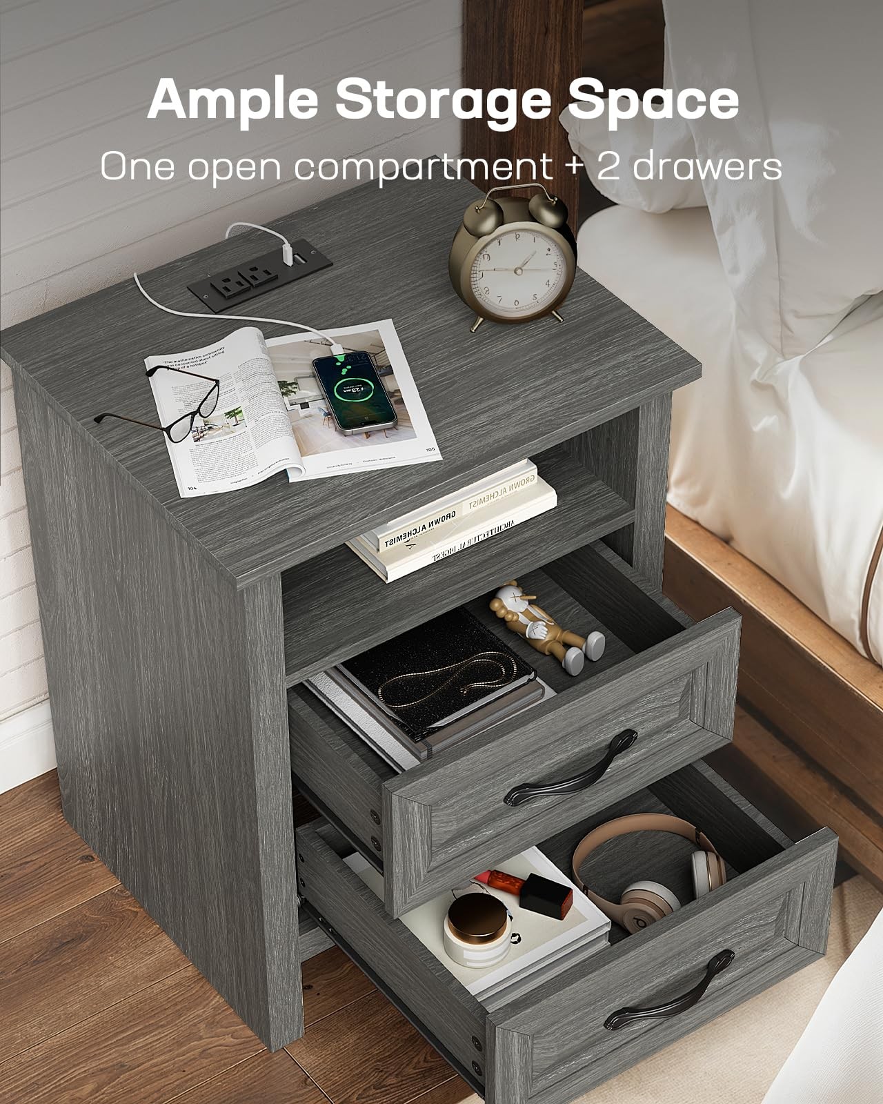 Versatile Farmhouse Nightstand - The farmhouse nightstand brings rustic charm to any room. As a bedside table it holds your lamp, phone, or book and as a sofa side table its ideal for resting coffee cups or magazines. The rustic nightstand with timeless design fits effortlessly into any space, enhancing your home's farmhouse style. Side Table with Charging Station Design - The wooden nightstand with charging features two AC outlets, a USB port, and a Type-C port, making charging easy on all your devices. This bedside table is more handy and practical. Additionally, the hidden outlet with a cable management system helps keep your bedroom or living room clutter-free. Spacious Storage Drawer Space - The farmhouse side table for living room offers a desktop (15.7"D x 18"W ), an open compartment and 2 storage drawers. The drawers feature pre-assembled, smooth-gliding tracks for effortless opening and closing. This ample storage space allows you to organize essentials. Enjoy easy access to your items on this nightstand with storage drawers. Exquisite Craftsmanship and Premium Materials - The nightstand with drawers is built to last and features a sleek tabletop that enhances both its visual appeal and strength. The wooden bedside table supports up to 176 lbs, and the drawer can bear 22 lbs and can easily store daily necessities. Every detail of the nightstands reflects the design to complement your living space. Durable and Easy to Assemble - Built with stability in mind, the farmhouse 2 drawer dresser is made from durable materials that last. With clear, easy-to-follow instructions, this bedside table is quick and hassle-free to assemble. The nightstands is available in multiple colors to suit your unique style.