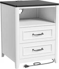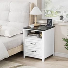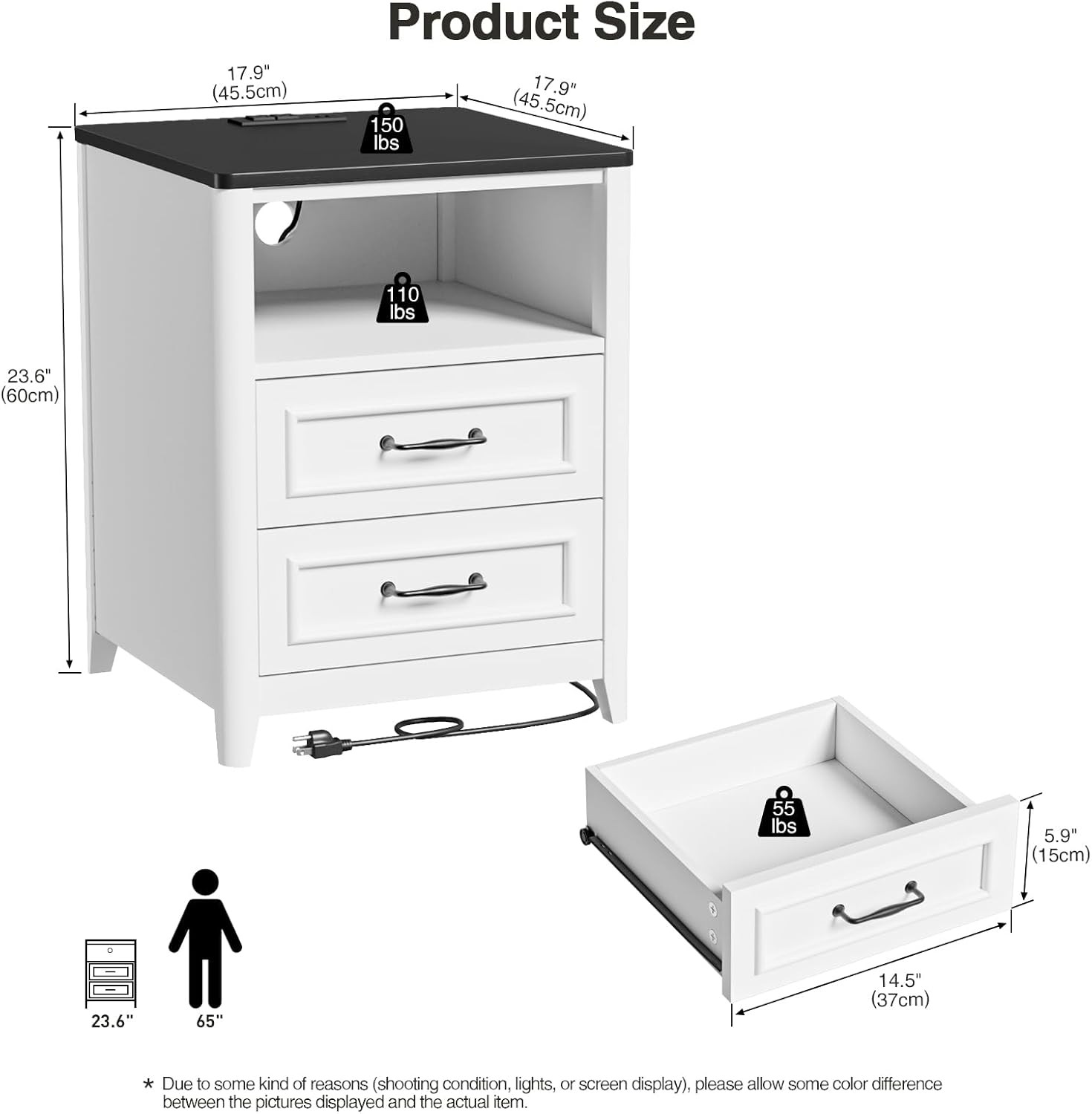 Product Description About this item FARMHOUSE NIGHTSTAD-This 2 drawer farmhuose nightstand features a refined and minimalist linear design that is visually appealing at any time. The nightstand with drawers retains the natural wood grain texture and a distinctive contrasting color scheme, making it suitable for various home decor styles. CONVENIENT CHARGING STATION-This nightstand equipped with charging station combines practicality with style. With built-in ports(2 Standard AC Outlets and 2 USB ports), it offers the convenience of charging your devices without leaving your bed. This smart design not only saves time but also enhances the tidiness and comfort of the bedroom. It's the perfect companion for modern living. MULTI APPLICATIONS - The wooden nightstand measures 17.8”D x 17.8”W x 23.6”H.It’s cute and compact for limited space next to bed in your bedroom or guest bedroom. The night table is also perfect for living room as an sofa end table, side table or accent table. A perfect choice for apartment, dorm, office. STABLE & STURDY CONSTRUCTION - The black nightstand is crafted from premium engineered wood, which is solid and well made for a long-time use. The metal strong base can ensure stability and durability. In addition, the tabletop is stain-resistant and wear resistant, easy to wipe clean during daily use. EASY ASSEMBLY - Our small nightstand comes with a detailed instruction and all necessary parts in the package. You can easily put all together and start using it quickly. Any problems about the package, please message us first and we will assist you within 24 hours. Farmhouse End Table with USB Ports&Power Outlets Bed Side Table with 2 Drawers for Bedroom Charging Station The wood grain finish adds a touch of warmth and sophistication, while the charging station keeps your gadgets powered up and ready to go. Side Table With 2 Drawers Two drawer bedside cabinet features an exquisite drawer front that adds a touch of sophistication to your bedroom decor. Metal Handle Metal black handles add vintage detailing and give this nightstand a dreamy glow. Sturdy Wood Legs Wooden Legs to ensure robust stability and large weight capacity.