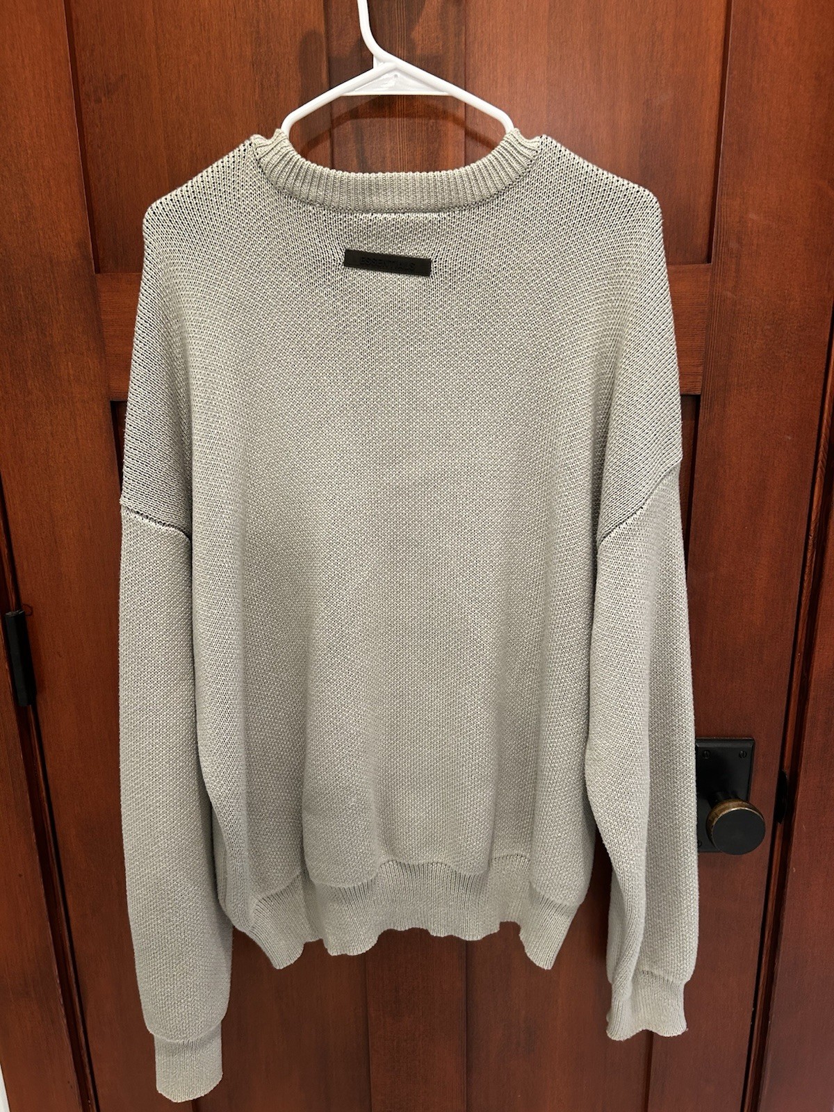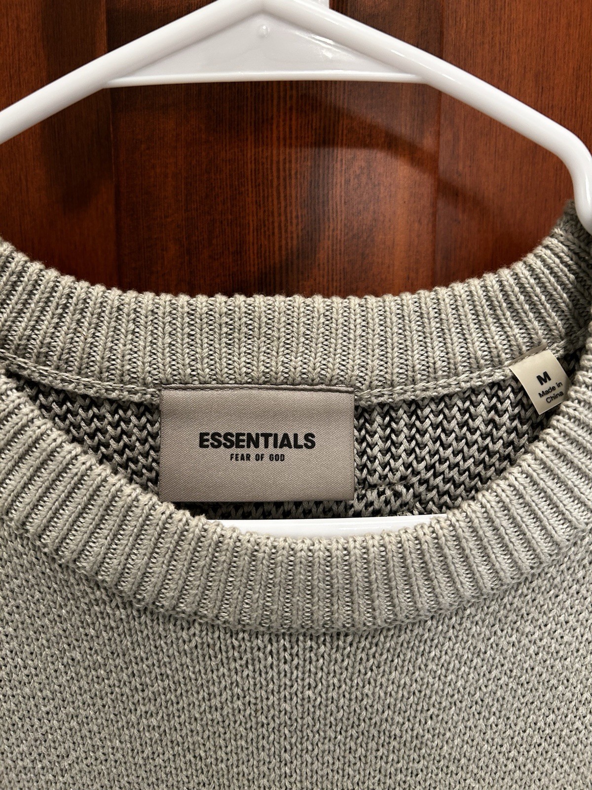 Small, removable stain on front. The Fear of God Essentials Men's FW21 Knit Pullover Sweater in Green Concrete is a stylish and versatile piece perfect for casual occasions. Made from comfortable cotton material with a knit fabric type, this sweater features long sleeves and a logo accent. The pullover style and size M make it suitable for everyday wear, while the brand Fear of God adds a touch of urban edge to the overall look. Ideal for walking and other activities, this sweater combines fashion and functionality for a modern man's wardrobe.