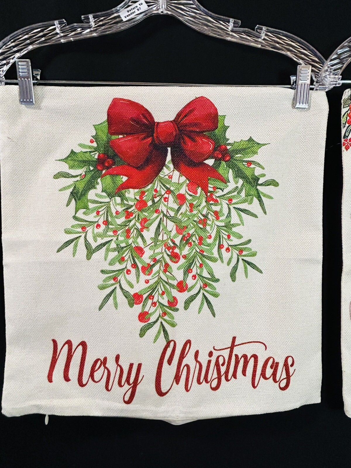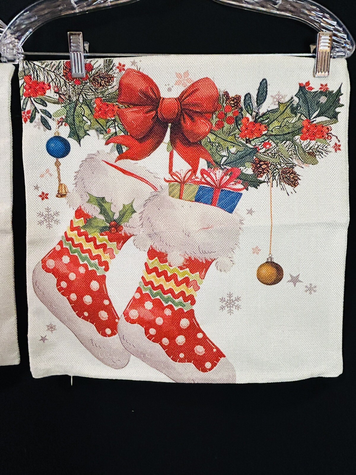 I bought four - only need two so these are extra. One says “Merry Christmas” with a greenery display second one has two stockings and greenery. Each measure 15” wide and 15.5” tall. Zip closure. New condition never used. Smoke and pet free home.