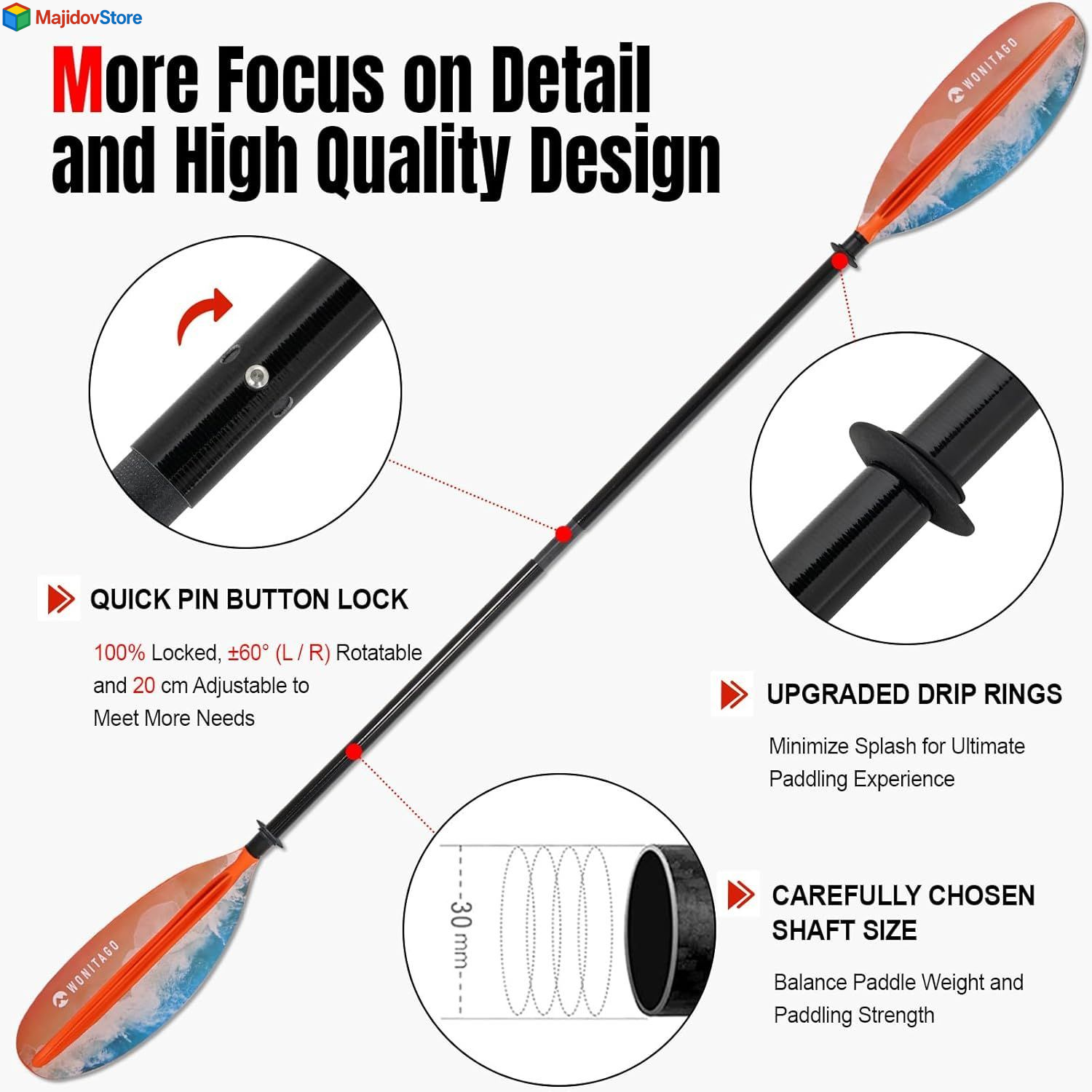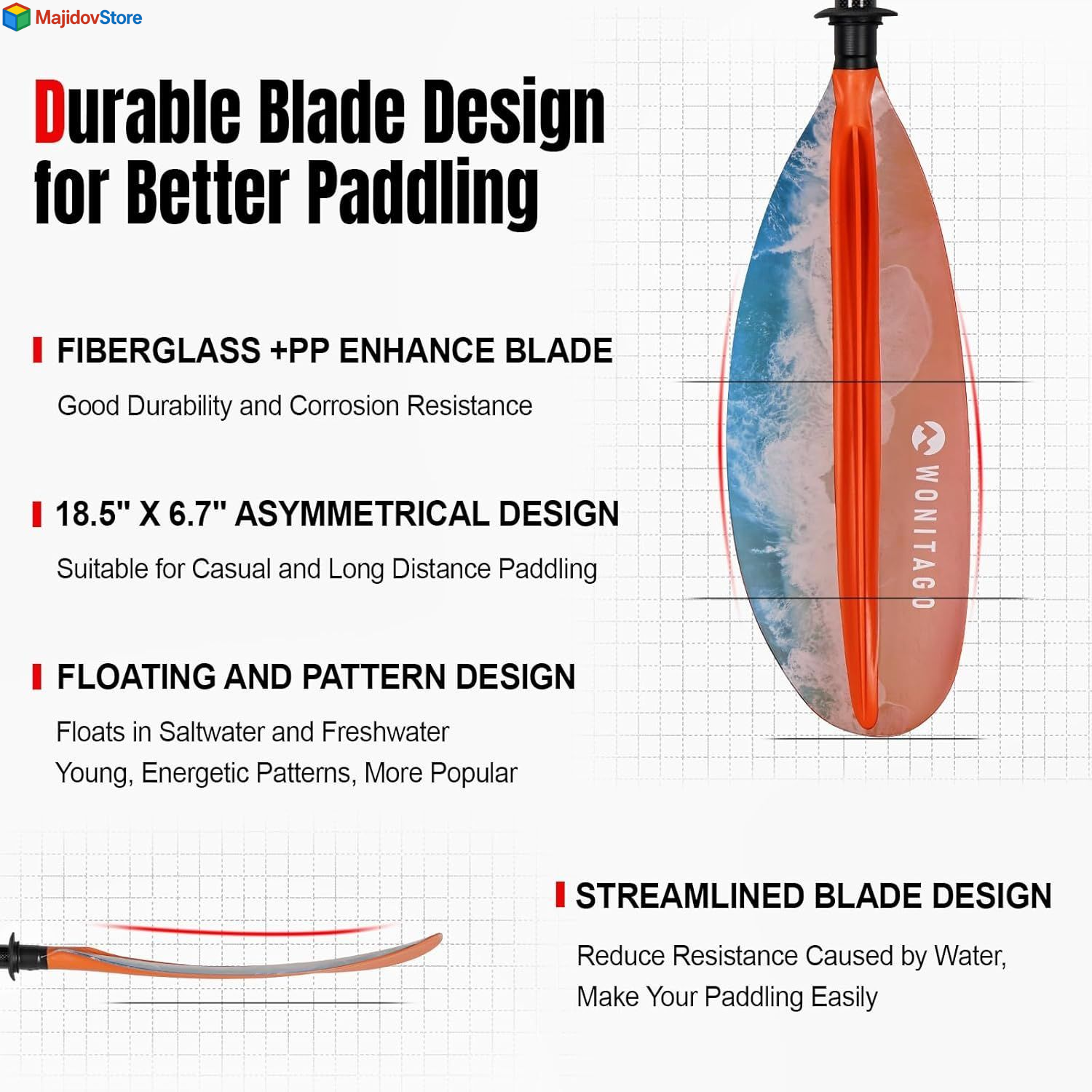 Kayak Paddles with Fiberglass Shaft and 220-240 cm/86-94", Ocean Orange Description Features: FIBERGLASS KAYAK PADDLE --- Crafted from the premium fiberglass shaft, lightweight and comfortable to use, allowing you to achieve maximum speed and control on the water. It’s sturdy yet with certain flexibility required to maintain better performance and protect the shaft from breaking FIBERGLASS +PP ENHANCE BLADE --- Our paddle blades have good durability and corrosion resistance, float in saltwater and freshwater. The streamlined design adds power and stability to the kayaking while reducing flutter of the paddle ADJUSTABLE KAYAK PADDLES --- The total length is 86"-94"/220cm-240cm, 20cm adjustable. Total weight is only 2.2 lbs (1.0kg). Suitable for most types of kayaks and paddlers. Whether you're a beginner or an experienced kayaker, our paddles provide the perfect balance of power and control, allowing you to navigate through any water conditions with ease A+ ADVANTAGE and DESIGN --- Travel friendly: 3-piece combined design makes the paddle more portable. Easy to use: ±60° Quick Pin Button Lock makes it easier to assemble fastly and adjust the paddle at any length to fit your kayak perfectly WHY CHOOSE WONITAGO --- Our kayak oars reduce fatigue and maximize performance, allowing you to paddle for longer without discomfort. So, whether you're exploring the coast, racing down a river, or enjoying a peaceful lake, our kayak paddles are the perfect choice for your next adventure Product Details: Closure Type: Pull-On Product Dimensions: 6.69"W Manufacturer: WONITAGO Item Package Dimensions L x W x H: 44.88 x 7.87 x 1.18 inches Package Weight: 1.2 Kilograms Item Dimensions LxWxH: 94.49 x 6.69 x 0.04 inches Brand Name: WONITAGO Country of Origin: China Model Name: Fiberglass Kayak Paddle009-Ocean Orange Part Number: Kayak Paddle009-Ocean Orange Size: 220-240 cm/86-94" Skill Level: Beginner Color: Ocean Orange Brand: WONITAGO Material: Fiberglass Shaft and PP Blade Sport: Kayaking Fit Type: Regular Handling We will ship all orders within 2 business day of payment. Delivery We Do Not Ship Outside of the Continental US. Return Policy All items qualify for returns within 30 days of receipt. Buyer is responsible for return shipping on any item that is not damaged. Feedback We take our reputation seriously, we buy and sell online, so we understand the value of trust. If you are unsatisfied with your order, please contact us and we will work with you to resolve it to your satisfaction.