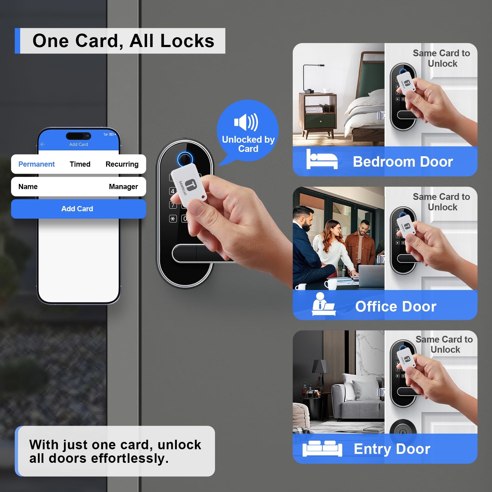 [Fingerprint Unlock - Family Friendly] Unlocking with a fingerprint takes just 0.3 seconds, offering quick access for family members; our 508 DPI high-resolution fingerprint sensor ensures up to 99.99% recognition rate; track all unlocking history using the smart app. [Code Unlock - Guest Friendly] Remotely create instant or scheduled door codes for family, visitors, and guests using the smart app, even when you are not at the property; ideal for homeowners, rental hosts, and property managers. [Secure Your Home] Automatic door locking to ensure your door is always locked after you leave; an alarm will trigger if unwanted intruders try to enter; privacy mode disables all access methods from outside when you need it; stay informed about your door's activity with all security alerts pushed to your smart app. [One Card, All Locks] Use one card to unlock all doors, eliminating the need to carry multiple keys and the confusion of which key is for which door; this feature is especially friendly for property managers who manage many properties. [Voice Control] Works with Amazon Alexa and Google Assistant for hands-free control through voice commands like "lock the front door”, "unlock the front door”, "check lock status”, etc. (Gateway Required, Sold Separately) [Locks Management] Manage all the locks via the smart app and web portal; log in web portal with your app credentials. [Easy Installation] Easy to install with just a screwdriver in 20 mins; no extra drilling needed; no hardwiring; door handle is reversible for both right-handed and left-handed doors.