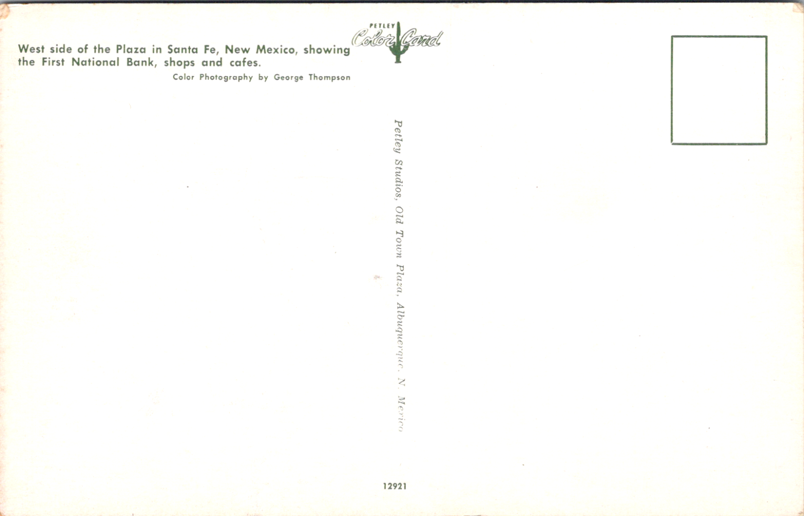 This vintage postcard depicts a street scene in Santa Fe, New Mexico, circa 1940. The postcard is an original printed lithograph by George Thompson and features a view of the First National Bank. The postcard is in its original state and has not been posted. The postcard measures 5.5 x 3.5 inches and is made of paper. It is a topographical postcard under the category of postcards and supplies, with a theme of architecture and cities & towns. The postcard is a great addition to any collection and is a must-have for those interested in the history of Santa Fe and New Mexico.