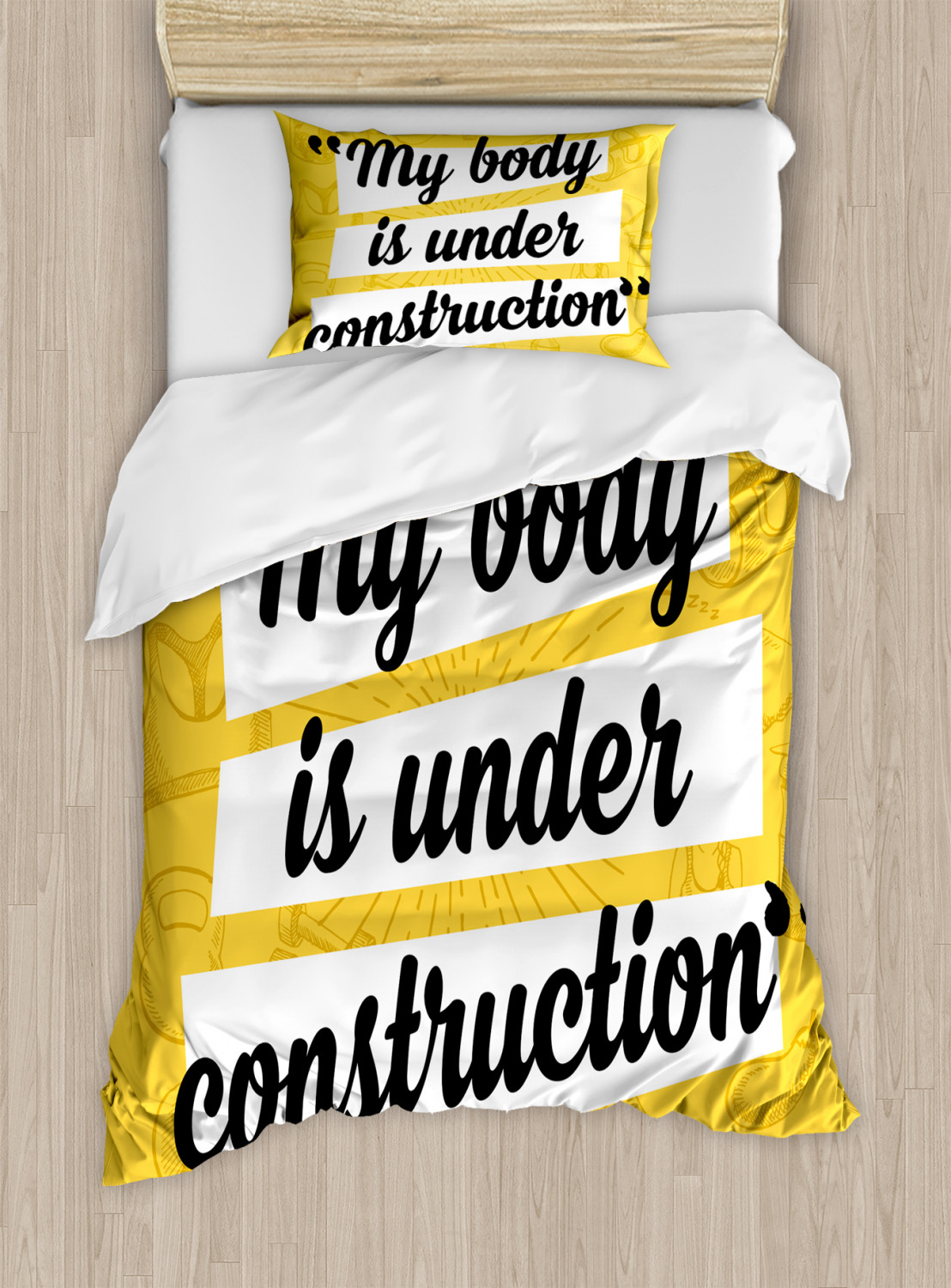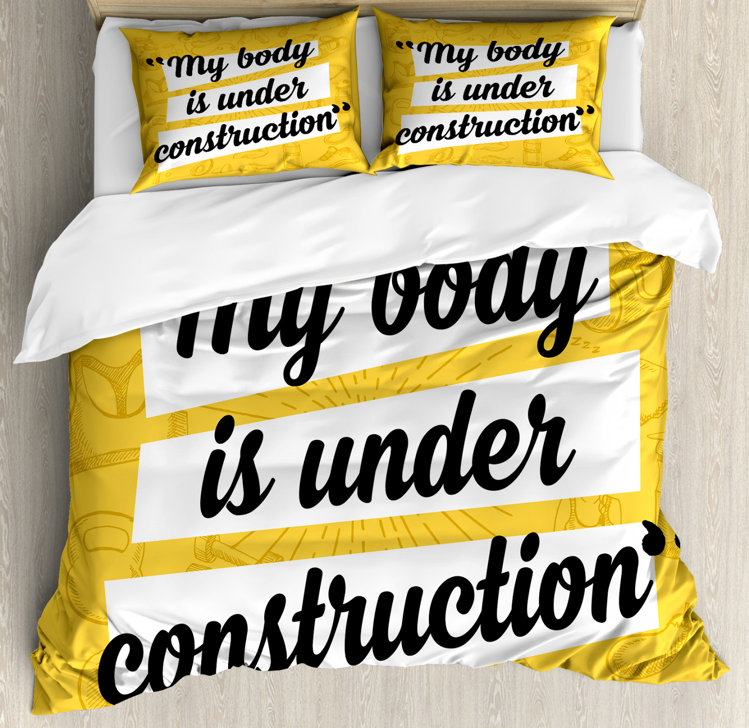 Fitness Duvet Cover Set King Size Quote Heathcare Icons with 2 Pillow Shams Time to embrace modern looks, feel-good fabrics, and high-quality materials! King, queen, or twin - these 3 pcs duvet cover sets will work in any bed for any season! Woven from 100% brushed microfiber fabric, our duvet cover collection is constructed for maximum strength and ultra comfort only for you and your beloved ones. All you need to do is to simply put our duvet cover on your comforter and secure it with zipper closure, and enjoy your new bedding set! MEASUREMENTS: KING SIZE SET: Duvet Cover (104" W X 88" L) and 2 Pillow Shams (36" W X 20" L). QUEEN Size Set: Duvet Cover (88" W X 88" L) and 2 Pillow Shams (30" W X 20" L). Twin Size Set: 1 TWIN Duvet Cover 68" X 88" + 1 Pillow Sham 30" X 20". The duvet cover FEATURES hassle-free hidden zipper and the pillow shams have an envelope closure. Please note that COMFORTER NOT INCLUDED IN THIS SET. This only duvet cover, allowing you to protect the comforter/duvet insert from dust, mites, and other stains. WRINKLE FREE - The microfiber material creates ultimate softness and comfort, also provides wrinkle, fade, and shrink resistance when properly cared for. Very durable and sustainable material that will not endanger your health or the environment, either. No chemicals used, No dye substance harming the health of you or your family, %100 microfiber recyclable environmentally friendly fabric. LOW MAINTENANCE: Machine washable in cold water. Suitable for tumble dryer use on low heat. Can be ironed on medium heat when necessary. Do not bleach. Choose your style between thousands of different and creative patterns. Or simply find your perfect gift idea ever for housewarming, birthday, bridal shower, Christmas, Mother’s Day, and newlyweds… You can find a theme for everybody and every interest in our Ambesonne Store. The images we display have the most accurate color possible but, due to differences in pc monitors, there can be slight color differences between the product and the image. Due to manual measurement, please kindly allow 1-2 cm discrepancy. The Duvet Cover and Pillow Shams are printed on the FRONT SIDE ONLY, the back of them are PLAIN WHITE-COLORED. This is ONLY the Duvet Cover, sold WITHOUT the Comforter.