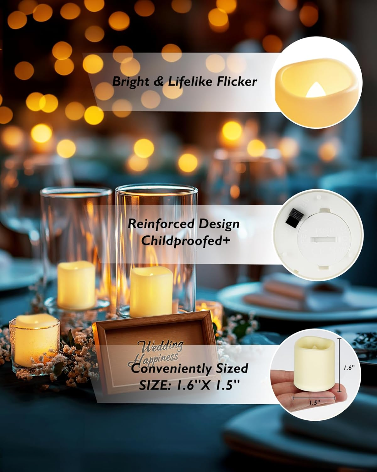 Long Lasting 200+Hour: These led votive candles(1.5"D x 1.6"H) come pre-installed with premium CR2032 batteries and will provide 200+ hours of continuous use. Easy to Use and Maintain: These candles eliminate concerns about fire hazards. They are also easy to maintain and reusable, allowing you to enjoy their beauty over and over again. Brightest Soft Light: These votive candles feature a realistic warm flicker, using latesting LED beads to emit bright, uniform soft white light. The pale yellow glow simulates a real candle, creating a cozy and warm ambiance. Safety First: These votive candles are thoroughly tested to ensure their reliability, and the secure battery cap design further enhances their safety. With (UN38.8) internationally certified batteries and healthy polypropylene materials, plus a secure battery cap design. Versatile Use: Perfect for home decoration, parties, events, and even as gifts. Their portable size makes them easy to carry and transport. You can take them with you to a picnic, a beach party, or any other outdoor gathering. Product Description