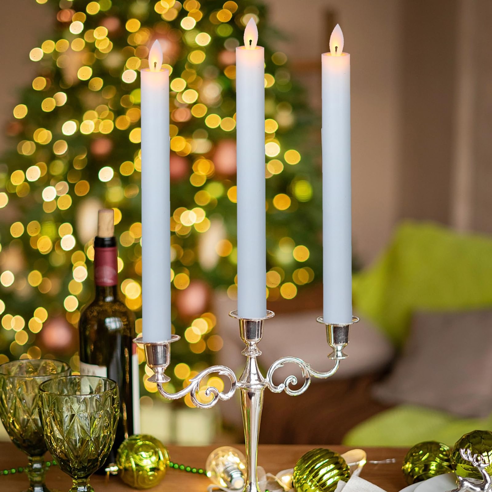 Flickering Flameless Taper Candles with Remote and Timer ✔PACKAGE LIST: You will get 2 white real wax LED window candles (0.78 "D x 9.5”H), one 10-Key remote, and one user manual.Moving Wick Patent Number: 11480309 ✔FLAMELESS CANDLE: Realistic flickering flame looks like real candles, Amber yellow glow light creates warm and romantic atmosphere in your room, can be widely used as wedding, family dinner, birthday, party, Thanksgiving, Christmas home window decoration candles ✔BATTERY OPERATED: Each flickering taper candle require 2 AA batteries(Not Included), no need to worry about smoking or dripping wax, safe and clean for your kids and pets ✔REMOTE AND TIMER: Easy and convenient for you to control all LED window candles ON/OFF/Timer/Flickering/Brightness with 10-Key remote. Four different timer modes meet your different needs. once the timer is set, cycle every 24 hours ✔OUR : Each flameless window candle has thoroughly tested before leaving our factory, if any problems occurs to our flameless tapers, please feel free to our , and you will get a satisfaction solution