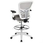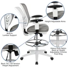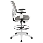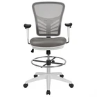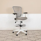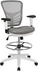 Flash Furniture Tyler Mid-Back Light Gray Mesh Ergonomic Drafting Chair with Adjustable Chrome Foot Ring, Adjustable Arms and White Frame Product Details Size: Set of 1 Color: Light Gray Mesh/White Frame Brand: Flash Furniture MPN: HL-0001-1CWHITE-LTGY-GG UPC: 889142653233 EAN: 0889142653233 Brand: Flash Furniture Color: Light Gray Mesh/White Frame Product Dimensions: 24.5"D x 25.25"W x 41.5"H Size: Set of 1 Back Style: Curved Brand: Flash Furniture Color: Light Gray Mesh/White Frame Product Dimensions: 24.5"D x 25.25"W x 41.5"H Size: Set of 1 Back Style: Curved Special Feature: Adjustable Product Care Instructions: SW-Solvent and water based cleaner such as foam Unit Count: 1.0 Count Recommended Uses For Product: Office, Drafting Style: Drafting Chair Pattern: Solid Room Type: Home Office/Study;Office Age Range (Description): Adult Included Components: Drafting Stools Model Name: Flash Furniture Arm Style: Adjustable Surface Recommendation: Hard Floor Furniture base movement: Swivel Indoor/Outdoor Usage: Indoor Furniture Finish: Chrome Seat Height: 31.5 Inches Seat Depth: 18 inches Fill Material: Foam Tilting: Yes Is Electric: No Is Foldable: No UPC: 889142653233 Global Trade Identification Number: 33 Manufacturer: Flash Furniture Item Weight: 38 pounds Item model number: HL-0001-1CWHITE-LTGY-GG Date First Available: November 18, 2019 Conduct your day-to-day work as an architecture professional, bank teller, or artist on this ergonomic drafting chair. The tall desk chair has an extended cylinder for standing desk usage. Contemporary executive draft chair with lumbar support Full swivel seat, contoured upholstered seat, chrome height adjustable foot ring Tilt lever - push in to lock in an upright position; pullout to activate rocking motion, while tilt tension knob controls tilt resistance PRODUCT MEASUREMENTS: Overall Size: 25.25"W x 24.5"D x 41.5-49.5"H; Seat Size: 19.5"W x 18"D x 23.5-31.5"H; Back Size: 15-19.5"W x 21"H; Arm Size: 30.5-40.75"H from floor; 7.5-10"H from seat Discover a new way of office seating with an ergonomic drafting chair. With a rise in standing desks you need a compatible office chair to travel the distance with you. Enjoy the comforts of an ergonomic office chair in a taller frame to meet the needs of students and professionals working at above average desk heights. If you're seeking an office chair to work at above standard heights in environments such as banks, architectural firms, art studios and other creative spaces a mesh back drafting stool is your perfect match. This draft chair features a ventilated mesh back with lumbar support to keep you cool along with a convenient lever to adjust the seat height and lock the seat in place to prevent you from rocking. Turning the tilt tension adjustment knob increases or decreases the amount of force needed to rock or recline. From standing desks to drafting desks this ergonomic drafting chair with contoured padded swivel seat will provide you with the comfort that you need to suit your work environment. Let this tall task chair deliver comfort while you scratch items off your to-do list.