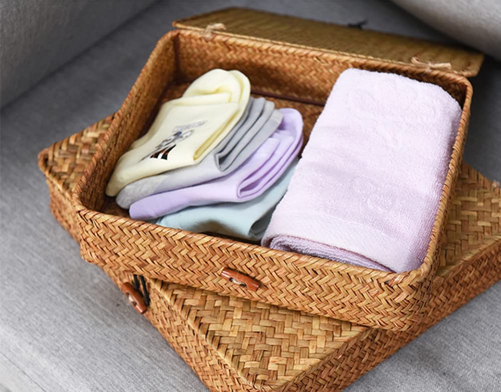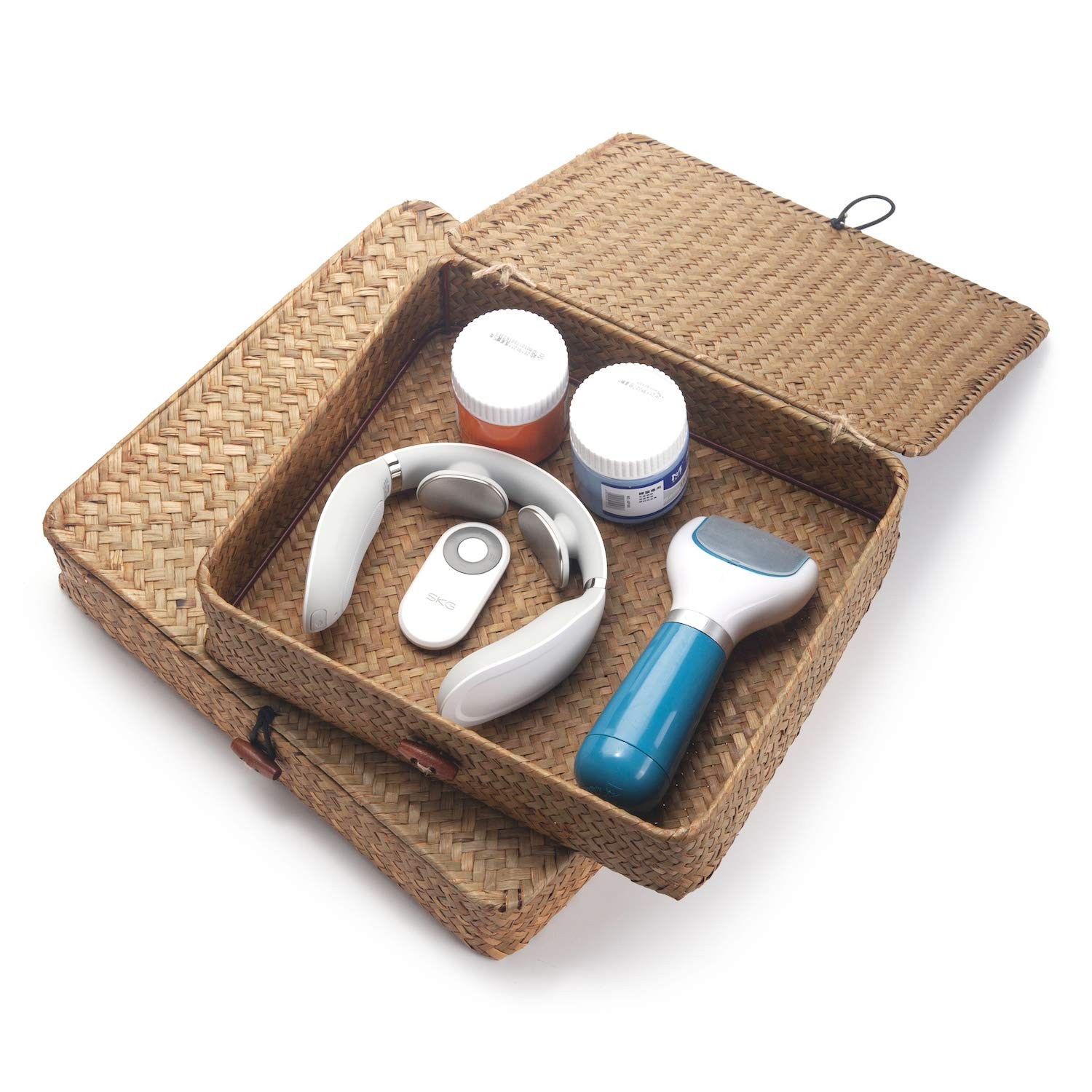 100% seagrass, include set of 2 pieces(S+L), Size: L: 12.6"x11"x2.4"H; Size S: 27*23*6, 10.6"x8"x2.3"H The organizer baskets can hold chargers, data cable, makeups, socks, underware to place on coffee table, shelf, kitchen, bathroom vanity, TV bench, wardrobe and dresser; The flat shape make it very flexible to be inserted to different places of your home. Neatly hand-woven natural seagrass baskets with lid, help you keep important things in one place and make your home clean and organized; The lid help to hide all clutter inside, make your home tidy and neat The warm brown color add a natural elegance and warmth feel to your home Premuim Material: 100% seagrass, adding a natural and genuine expression to any space. Include set of 2 pieces(S+L), Size: L: 12.6"x11"x2.4"H; Size S: 27*23*6, 10.6"x8"x2.3"H. All-Occasion Storage: The wicker baskets with lids can hold chargers, data cable, makeups, socks, underware to place on coffee table, shelf, kitchen, bathroom vanity, TV bench, wardrobe and dresser. Home Decor: Woven Storage Baskets are a great way to add storage or decorate your home or other living spaces. The flat shape make it very flexible to be inserted to different places of your home. Practical Use: Neatly hand-woven natural storage with lid, help you keep important things in one place and make your home clean and organized. Elegant Style: Natural seagrass baskets not only have the storage function, but also integrates the natural charm into the home life, The warm brown color add a natural elegance and warmth feel to your home.