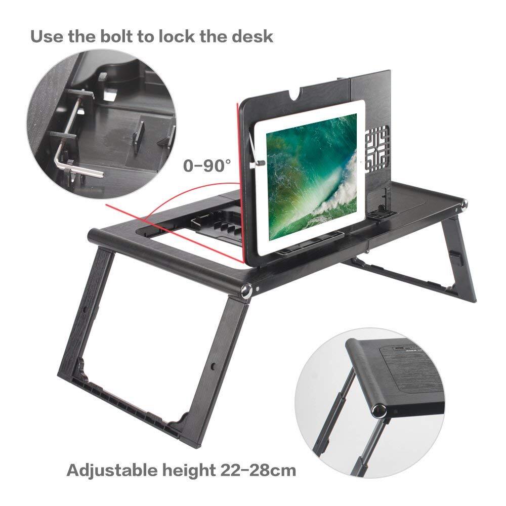 OUR ULTIMATE LAPTOP WORKSTATION ALLOWS YOU TO RELAX OR WORK ON THE COUCH, THE FLOOR OR IN BED! Are you looking for a table that can hold your computer, mouse, writing materials, while you work on the sofa or in bed? Are you tired of straining your back just to get a proper view of the moving you are watching in bed? Are you tired of laptop burns due to placing your computer on your laps while gaming? This innovative table can solve all these challenges and even more like recharging your tablets or smartphones plus a touch switch LED light so you can see properly! FEATURES OF OUR LAPTOP TABLE FOR BED: AMPLE TABLE SPACE - Offers ample space to carry your 14-15” ultra thin notebook computer. EASY STORAGE - Compact with legs that can be folded to enhance storage. DURABLE - Sturdy and made from quality ABS plastic with reinforced tungsten steel. LIGHTWEIGHT - Portable and easily carried from bedroom to dining to couch, etc. ADJUSTABLE - The height and viewing angle of the table can adjusted for a better experience. INNOVATIVE DESIGN - With built in power bank, you can continue working or watching movies without fear of power disruptions! PROBABLY YOU WANT TO KNOW Q: How to get the table leg back? A: Just pull it slightly backward before push back. Q: What's the size of table? A: The desktop size of this table is 22"x13"(56x33cm), when folded, it's 13"x11"x2"(33 x 28 x 5cm). The desk is fit for 15" below laptop. The width between legs is 30"(78cm), max desk height is 12.79"(32.5cm). Q: How to recharge for the table? A: It It can be recharged with your phone adaptor with provided micro usb. Q:How to turn on and off the power? A:Press the button once to open it. Press it twice in a row to turn off the power. INNOVATIVE DESIGN WITH BUILT IN 10,000MAH POWERBANK AND LED LIGHT – We understand that there are times, you really need to work in bed, or lounge/watch a movie on the sofa. Hence, we are offering you an innovative lap desk/workstation with built-in 10,000mAh power bank to recharge your phones/tablets, with touch switch USB LED light providing illumination so you can see properly. ADJUSTABLE HEIGHT LAP DESK – You can raise the height of your laptop to eye level using our stand. Our laptop table offers you a wonderful viewing angle experience, when watching your favorite soap/tv shows/youtube videos etc! STURDY AND DURABLE DESIGN – Made of durable ABS plastic and reinforced with tungsten steel. Our stand is sturdy and can carry a laptop weight up to 25kg without fretting! MULTIFUNCTIONAL USAGE – Use it as a reading and writing table, study table for kids to do their homework, a laptop workstation(ultra thin laptop), breakfast in bed lap tray, standing table for office, etc. We left no stones unturned in ensuring that you are totally satisfied. COMPACT DESIGN WITH FOLDABLE LEGS – Allows you to stow the desk away when not in use, thereby saving space. It is PORTABLE, LIGHTWEIGHT, easy to carry around and used on the go!