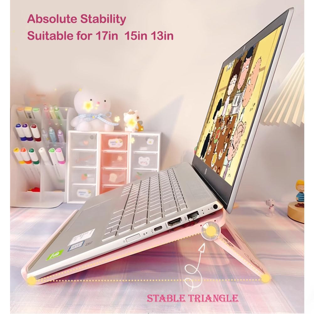 💻SUPER STABLE: The laptop stand with super stable triangle design can support all computers within 17 inches(Such as MacBook Pro Air 13''/16''/15'', Powerbook, Lenovo Thinkpad, Dell /Precision, HP, Microsoft Surface, Acer, ASUS, Google Chromebook etc.). This laptop Desk holder never wobble during use. You can rest your hands on the keyboard to type and this laptop stand is very quiet, suitable for home, office, library, meeting room, Coffee shop 💻UNRESTRICTED USE ANGLE: This laptop stand can be adjusted from 0°-130°(Adjustable height range:68mm-110mm). You can adjust the angle according to your needs. This design is ergonomic and relieves shoulder and neck pain. It’s connection has non-slip silicone, which is very firm. It is much more practical than a laptop holder with only 6 adjustment angles 💻HOLLOW HEAT DISSIPATION DESIGN: The entire surface of the panel of the laptop Mount is hollowed out with diagonal stripes to help the computer dissipate heat. The whole bracket is made of high-quality ABS material. This material will not absorb heat or become hot, and will not harm the computer 💻ANTI-SLIP DESIGN: There is super anti-slip silicone on the edge of the adjustable notebook stand. The bottom of the laptop stand is a "C" shape, and there is also non-slip silicone. The double protection makes the laptop more stable on the stand. This laptop mount holds the laptops, tablets, projectors, menu, music books, magazines etc. 【Gift Cord Organizer x 2】 💻ULTRA-THIN AND PORTABLE DESIGN: The size of the laptop riser: 24.5cm × 24.5cm × 4cm (9.6'' × 9.6'' × 1.5''). This foldable laptop stand is smaller than a 13-inch laptop, and can be easily carried in a laptop bag or briefcase. Compatible for business trip, travel, and outing use. Suitable for students, teachers, white-collar workers, programmers, and people who use computers frequently