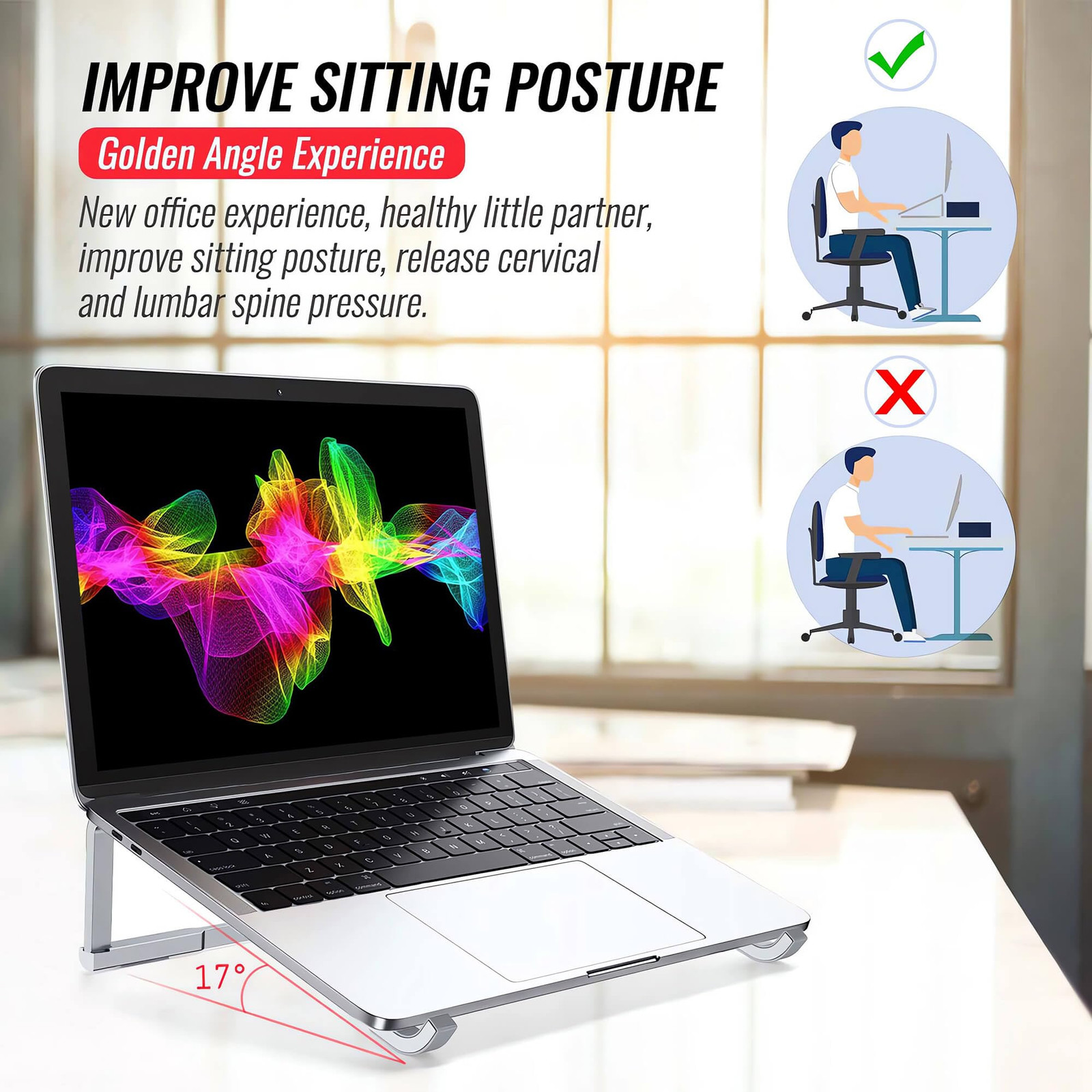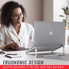 ✅ Foldable & Portable Design: Its small size and light weight (only 6-7 ounces) make it easy to carry around, and it's the first choice for daily office work, business trips, and outdoor work. ✅ Aluminum Alloy Material + Non-Slip Silicone Pad: Aluminum alloy has good thermal conductivity and corrosion resistance, with the characteristics of light weight and high strength, is one of the first choices for laptop stand materials. The non-slip silicone pad is attached to the contact area between the laptop and the stand, increasing the friction between them, thus ensuring that the laptop remains stable during use. ✅ Frame Structure: It is assembled with 3 aluminum alloy strips, and the bottom of the laptop is exposed to the air, which is more suitable for heat dissipation. ✅ Ergonomic Design: It can help users maintain a good and healthy sitting posture, keep an appropriate distance from the laptop screen, and reduce the discomfort of eyes, neck, back, and waist caused by prolonged use of laptops. ✅ No installation required, easy to use and store, just 2 steps to open the folding stand.