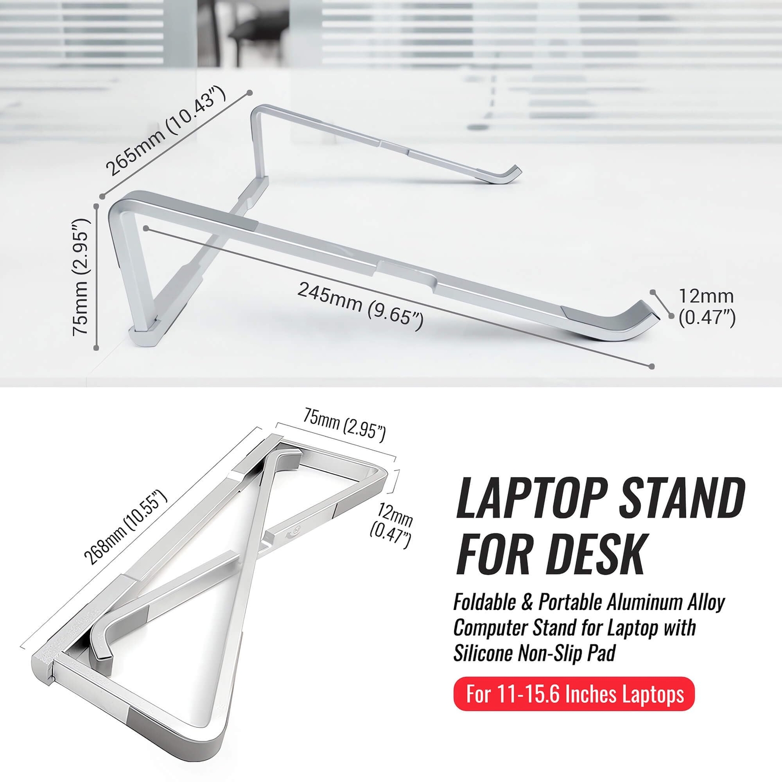 ✅ Foldable & Portable Design: Its small size and light weight (only 6-7 ounces) make it easy to carry around, and it's the first choice for daily office work, business trips, and outdoor work. ✅ Aluminum Alloy Material + Non-Slip Silicone Pad: Aluminum alloy has good thermal conductivity and corrosion resistance, with the characteristics of light weight and high strength, is one of the first choices for laptop stand materials. The non-slip silicone pad is attached to the contact area between the laptop and the stand, increasing the friction between them, thus ensuring that the laptop remains stable during use. ✅ Frame Structure: It is assembled with 3 aluminum alloy strips, and the bottom of the laptop is exposed to the air, which is more suitable for heat dissipation. ✅ Ergonomic Design: It can help users maintain a good and healthy sitting posture, keep an appropriate distance from the laptop screen, and reduce the discomfort of eyes, neck, back, and waist caused by prolonged use of laptops. ✅ No installation required, easy to use and store, just 2 steps to open the folding stand.
