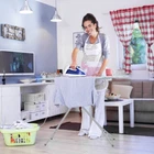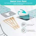 Foldable Ironing Board Heavy-Duty Metal Frame With Iron Rest & Adjustable Height ● Dual-layer Ironing Board Cover: The outer printed fabric cover is machine washable for easy cleaning and maintenance. The ventilated 100% cotton padding provide a good cushion for ironing while permitting the absorption of excess steam deliver smooth ironing results. ● Adjustable Height and Locking Design: Enjoy versatility with the adjustable height design! This ironing board offers 7 available positions, ranging from 27" to 36" (Each gear is 1.5"). Moreover, the locking design with convenient handle provides a secure and stable ironing experience. ● Sturdy Heavy-duty Metal Frame: The sturdy heavy-duty metal frame supports up to 66lbs/30kg, which can greatly meet your daily needs. The ironing board is also equipped with foot pads to prevent slipping. ● Extra Iron Rest: There is an extra metal iron rest which can be used as both a platform for your iron and shelf for your clothe rack. The metal material is heat-resistant, while the rubber pads help hold the iron in place for safety. ● Easy Folding and Storage: The ironing board is easy to store and can be folded quickly. Store it behind doors, against walls, or in the corner of your laundry room effortlessly, optimizing space and keeping your area tidy. Color: Turquoise Material: Cotton, Fabric, Sponge, Metal Overall Dimension: 56.5" x 15.5" x 27" - 36" Available Heights: 91cm Dimension of Iron Rest: 12" x 8" Folding Size: 62" x 15.5" x 2" Weight Capacity: 66 lbs Net Weight: 10.5 lbs