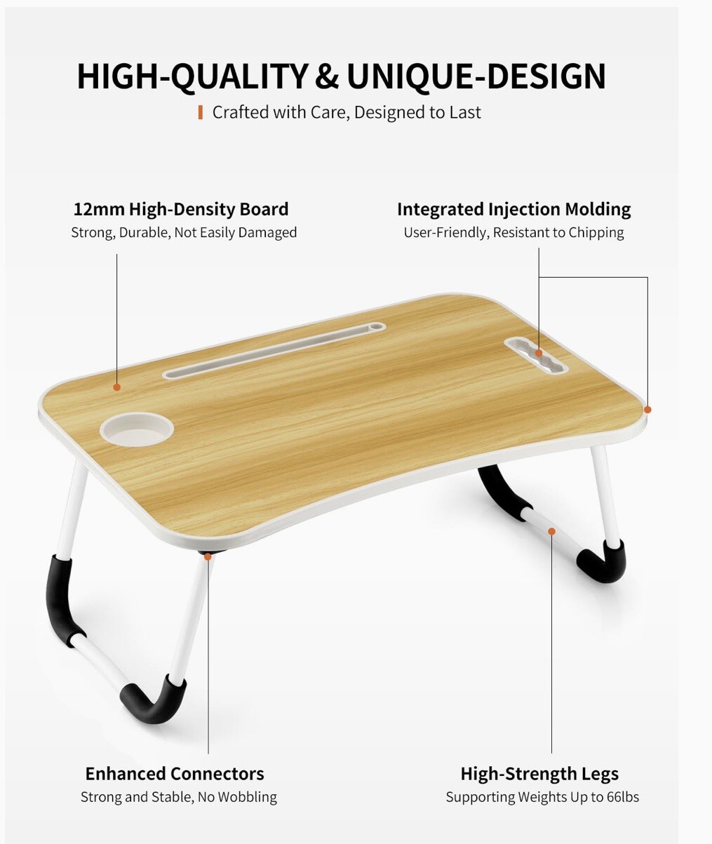Multi-Functional: This laptop table is designed for versatility. Use it on the bed, the ground, the carpet, the sofa, the desk and even on the grass. Enjoy the freedom to work, write, or have breakfast in the most comfortable position on your bed, couch, or floor. • Strong & Stable: The foldable bed table/lap desk is made from high-quality materials that ensure durability and stability. The legs use high-strength connectors which provide a sturdy and reliable surface for all your work, study, or leisure activities. • Humanized Design: All edges of the table top are molded in one piece, which makes it more durable and comfortable. It is equipped with a cup holder and tablet slot allows you to easily place your cup and iPad . Each leg has two anti-slip pads, even if you stay in a soft and slippery place, it will not shake or fall over. • Portable & Space-Saving: The thickness of this lap desk is only 1.77 inches when its legs are folded. When not in use, you can conveniently store it under the bed or sofa to save space. Additionally, it features a handle design, allowing you to easily carry it to any location, including outdoor use. • Large Size Desktop: The dimensions (LxWxH) of this table when opened are: 23.5x15.7x10 inches. The tabletop can accommodate a large-sized laptop, a mouse, notebooks, tablet, cup, cellphone, and other items. The leg space is also spacious enough, making it suitable for people of various body sizes and age groups to use.