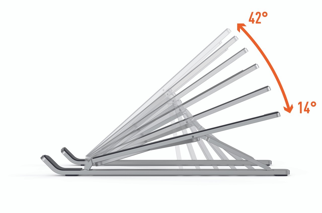 Universally adjustable stand for laptops and tablets up to 15" Space-saving, foldable and easily portable Height adjustable in 6 easy steps Facilitates ergonomic working with its flexible height and tilt angle adjustability Maximum load capacity: 11 lbs Non-slip rubber pads protect against scratches Includes practical travel bag
