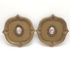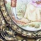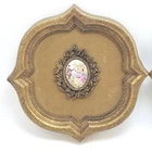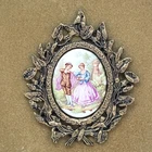Vintage Porcelain Courting Couple Framed Medallion On Velvet. Lot of 2 both included Porcelain fragonard signed Courting Couple Medallions surrounded by ivy and floral setting. Backing is a light brown velvet and a gold tone plastic frame. Ready to be placed on a wall both are in very good condition with a couple of light scratches to the velvet. Porcelain Medallions measure 2" x 1 1/2" Overall measurements of frame is 9" x 9"