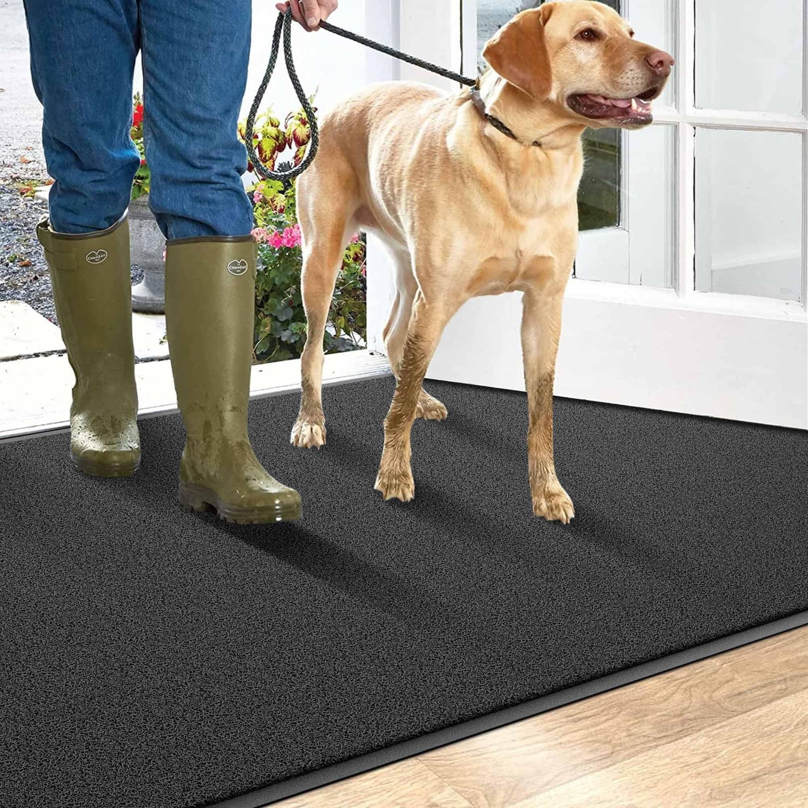 outdoor door mats for outside entry - the superhero of cleanliness for your home entrance! Made from top-quality PVC material, this entrance mat is tougher than average indoor door mat. It swiftly absorbs dirt, dust and moisture, keeping your floors clean and dry. With its non-slip backing, it stays securely in place, providing outstanding slip resistance. Cleaning is a breeze - just tap, shake, or use a vacuum or hose. Outside door mats for front door comes in versatile sizes to fit any high-traffic area. It’s low-profile design adds warmth and charm to your doorstep. Elevate your entryway with our front door mat outdoor entrance and make a lasting impression from the moment guests arrive. Specifications: Product Name: Doormat indoor entrance Size: 36" x 48" Color: Black Material: Premium Quality PVC Thickness: 0.3 inch Weight:7.53 LB Occasion: Our indoor door mats for entryway widely used for all weather, works as commercial door mat, industrial rugs for entryway, outdoor welcome mat, industrial mats for floor, shoe mat, Muddy Mat, dog doormats, commercial rugs, commercial floor mat ect. It can scrap off dirt, water, dust,grit, sand,mud, slush, sleet, grass or retain, snow. Effectively Capture Dirt: With an ultra-dense bristle topside, our outdoor mat effectively traps dust, mud, dirt or snow from shoes or pet paws. Ensuring your home floors stay clean and dry Easy to Clean: Simply tap and shake the back of the front door mat, use a vacuum or hose quickly removing dust and debris. For deep clean, rinsing the outdoor doormat with hose to remove stubborn dirt and air dry to restore its shine and freshness. Ready to warmly welcome your guests Extra Large and Versatile Use: Our outdoor mats for front door are extra large and multiple sizes suitable for various outdoor or indoor use: commercial industrial areas, shopping mall entrances, outdoor patios, garages, garden entrances and other high-traffic areas Durable for High Traffic: The door mat indoor entrance is made of premium PVC material, with higher tensile strength and tear resistance, the entryway rug stain and fade resistant, soft and flexible design can withstand a variety of weather conditions for years Non Slip Backing: Our welcome mats for front door features a textured rubber backing that adhere tightly to the floor and provide excellent non-slip performance. Please keep the floor dry and the front door rug laid flat before placing it, it is more safe and cozy