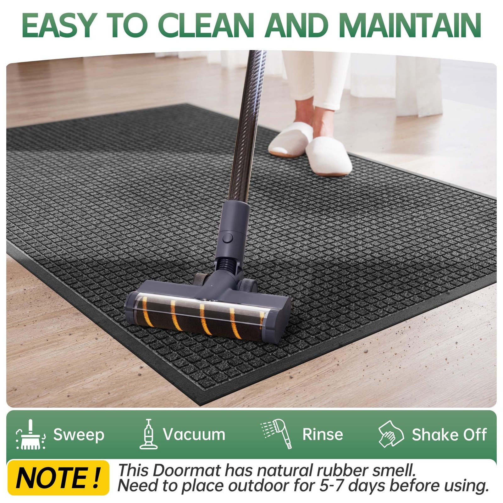 Keep your floors clean and dry with our incredible outdoor rubber door mat! Offered in a classic commercial design, this commercial door mat has added weight for extra durability, making it ideal for homes and businesses. The polypropylene woven topside entryway rug resists fading and capture dirt and moisture. Anti-slip natural rubber backing to keep the commercial floor mat in place while providing superior strength and tear resistance. Ideal for high traffic indoor or outdoor entryways. Easy to clean - simply shake off, sweep, or vacuum excess dirt and debris. The door mat outside entrance can be used in all weather conditions and seasons. The low-profile design allows for easy door opening. The outdoor mat can protect hardwood, vinyl, tile, carpet and many other high-traffic surfaces from outdoor debris, accident damage or general wear due to foot traffic. The commercial rug is suitable for residential, commercial (shops, restaurants, stores, etc.) and municipal (government buildings, schools, etc.) use that can enhance almost any space. Product specifications: Specifications: Size: 5' x 3' (60" x 36") Color: Charcoal Material: High Quality Polypropylene woven Topside, Nature Rubber Backing Weight: 23.72 LB Occasion: Our large door mat widely used for all weather, all season, works as commercial mats, commercial rugs for entryway, industrial floor mat, industrial door mat, front door mat, outdoor door mat, welcome door mats, entry rug, entrance mat rug, shoe mat, dog doormat, garage rugs and mats, floor mats for house ect. It can scrap off dirt, water, dust,grit, sand,mud, slush, sleet, grass or retain, snow. Deep Grooves Trap Dirt & Absorb Moisture: The sturdy outdoor door mat features high-density polypropylene weave topside and deep grooves to capture dirt, mud, and moisture. The sturdy beveled rubber border and retention dam block excess water, keeping floors dry and clean in any weather Non-Slip & Low Profile: outdoor welcome mat features a durable natural rubber backing to stay securely in place, eliminating slip worries. The entry mat’s low profile (0.25 inch thick) fits most entryways, allowing doors to open and close smoothly without getting stuck Built Tough For High Traffic Areas: The outdoor mats for front door is constructed to withstand all-season weather. Perfect for daily use and high traffic areas inside or outside. The door rugs for entryway feature a woven topside and natural rubber backing for superior strength and durability Easy to Clean: Our outside door mats for front door are easy to maintain. Simply tap and shake off debris, or use a vacuum or broom for quick results. For deeper cleaning, rinse the entrance mat with a garden hose and hang to dry in a ventilated area. Always ready to warmly welcome your guests Multiple Sizes & Versatile Use: Our front door rugs come in multiple sizes (4’ x 2’, 6’ x 2’, 4’ x 3’, 5’ x 3’, 6’ x 3’, 6’ x 4’) to fit various doorways and spaces. The extra large door mat is perfect for high-traffic areas like outdoor entrances, patios, porch, garages, gardens, and commercial spaces