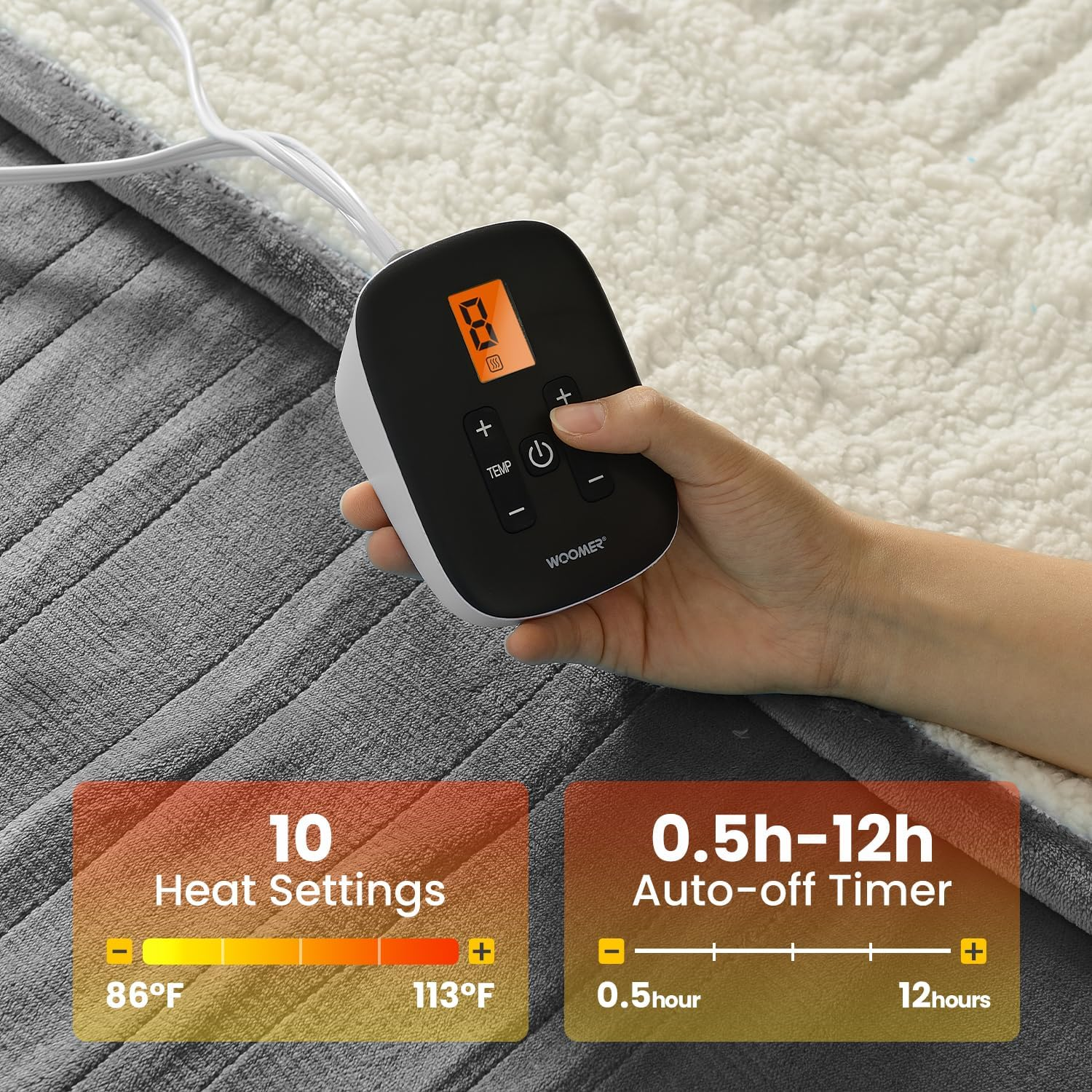 Store New Arrivals Add to Favorite View Feedback Contact Heated Blanket, Full Size 77"X 84" Soft Flannel Fast Heating Blanket with Multi-Color Option, 10 Heating Levels & 0.5-12H Auto Off, Over-Heat Protection Description Style Modern Number of Items 1 Pattern Solid Country of Origin China Blanket Form Single Layered Blanket Theme Plain Unit Count 1.0 Count Batteries required No Product Dimensions 77"L x 84"W Material Sherpa Age Range (Description) Adult Seasons Winter Item Weight 6.3 pounds Size Full Size 77" × 84" Special Feature Essential Fabric Warmth Description Heavyweight Color Gray-flannel&sherpa Recommended Uses For Product Reading, Napping, Working Sport Camping Fabric Type Polyester Product Care Instructions Machine Wash Number of pieces 1 Polyester Premium Bedding Fabrics: The heated blanket is crafted from breathable flannel and Sherpa with a thin 4mm short fur. It feels smooth and soft on the skin for maximum comfort. Machine washable under 49°C to maintain its quality. Simple Control: Easily switch between 10 heat levels (86℉ to 113℉) using the controller. Set the Auto-Off timer from 0.5h to 12h in 0.5/1h increments. The 28-foot extra-long cord offers flexibility and convenience. Superior Heating Technology: This 77"x 84" full-size electric blanket features U-shaped heating wires for even heat distribution, ensuring exceptional comfort. Fast heating technology provides instant warmth on cold days. Safety Protection: ETL certified, the Woomer heating blanket is designed with overheat protection for safety. The Auto-Off timer allows secure and worry-free sleep in cold weather. What You Get: Woomer 77" x 84" electric heated blanket and long-term of after-sales service. All inquiries are responded to within 24 hours. Product Description One Button Easy Control Use the controller to easily switch between the 10 heat levels from 86℉ to113℉ and set 0.5h -12h auto-off reservation. Fast Heat & Energy-Saving Adopts upgraded double layer heating wires to ensure efficient safe, fast and even heating. Long Cord 9ft long power cord allows you to conveniently reach power outlets anywhere in the room. Reliable and Caring We promise 5-year repair or exchange on our products plus 30-day return for the most comprehensive service. 1 Warm Plus 2 Giftable 3 Machine Washable ABOUT US We offer the best prices around on high quality products. Our E-store includes media such as books, movies, music and games while offering electronics, toys, sporting apparel, clothing, tools, general home, garden items and more. SHIPPING We are always working hard to ensure your package arrives as soon as possible. Please understand that some factors like weather, high postal traffic, and the performance of shipping companies are outside of our control. We offer free shipping to the lower 48 states and ship within 2 business days of payment, usually sooner. We do not accept P.O. Boxes. Please provide a physical address. For shipping outside of the continental USA, we only use eBay's Global Shipping Program.The item is shipped to KY and then sent to the rest of the world. International customers are responsible for all duties and taxes. Continue to check out in order to calculate costs for shipping the item to your country. Messages regarding eBay's Global Shipping Program MUST be directed at eBay EXCLUSIVELY. RETURNS We offer a 30-Day Return Policy on items which you are not completely satisfied with. You have the option for a full-refund or an exchange of the item. No returns are available on items shipped outside of the USA. PAYMENT We accept PayPal. CONTACT US This page content is yet to come Please ad us to your favorite seller and visit again later Thank You CUSTOMER SATISFACTION We try our very best to make sure every customer is completely satisfied. If there's a problem, message us! We're happy to help.