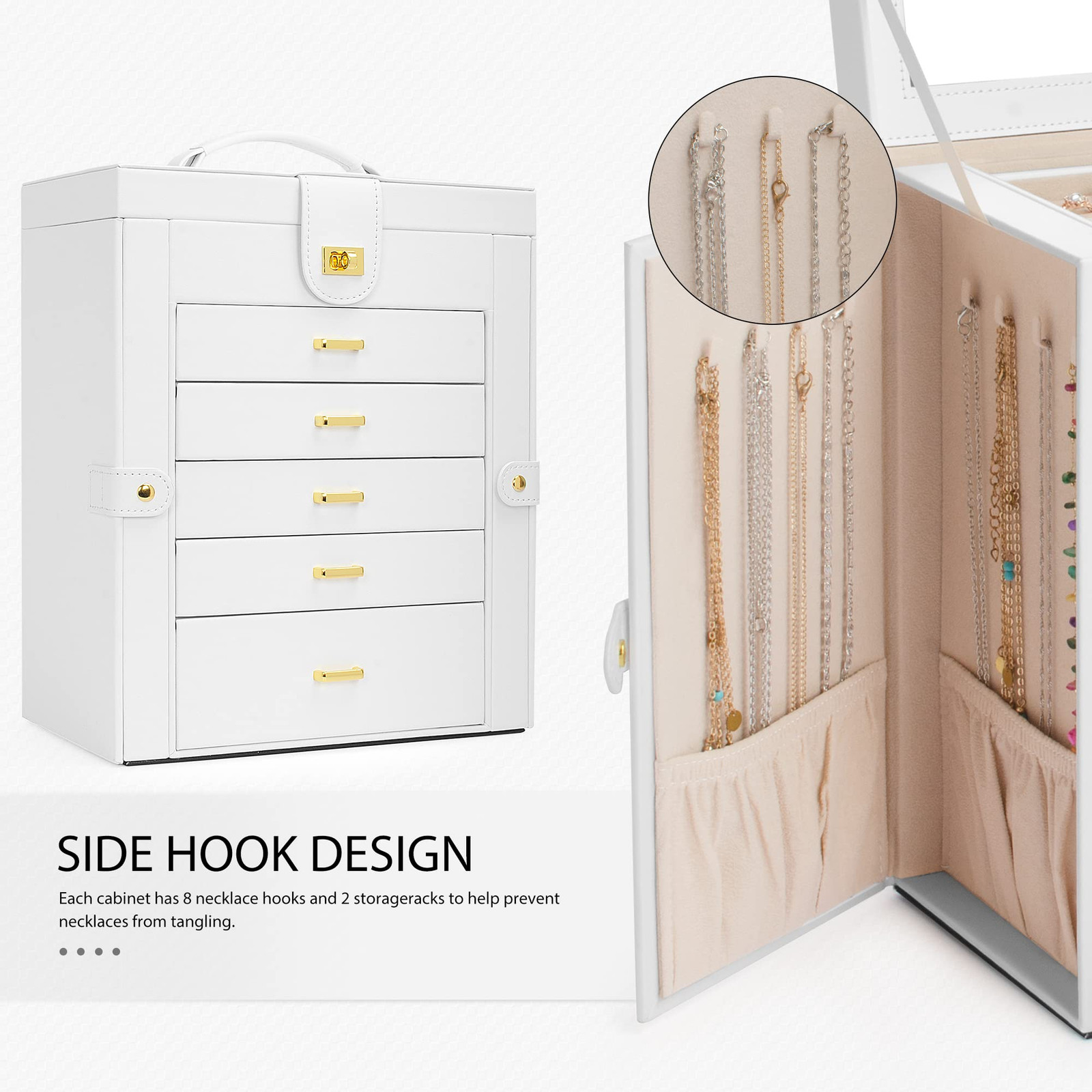 Elegant Durable, Attractive appearance with leather surface and soft velvet lining. Sturdy construction and quality material make it very durable. The jewelry holder can tidy your table and protect your precious jewelry for a very long time .Material: MDF(Medium Density Fiberboard),Velvet,Faux Leather Large Mirror, This mirrored jewelry box comes with a built-in large mirror on top lid, making it easier to dress yourself. The lid has a ribbon attached to keep it from falling back. With a grab-and-go handle, convenient to carry around; delicate buckle for one-hand easy opening, easy to use and saving your time LARGE CAPACITY, With 6 versatile pull out drawers, this white jewelry box can store a lot of jewelry accessories, such as rings, earrings, necklaces, chains, bracelets, and so on 6 LAYERS, With 5 Versatile Pull Out Drawers 2 Hidden Side Cabinets, The top layer is a removable ring layer With big mirror,The two deeper bottoms of the 5 removable drawers has only one compartment; Drawer 1 has 16 equal size slots; Drawer 2 has 9 equal size slots; Drawer 3 has 3 equal rectangle size slots. The 2 Swing out Cabinets including 8 hooks and 2 pockets, help to keep your necklaces from getting tangled Nice Present, Jewelry Organizer is nice choice for Valentine's Day, Mother's Day, Thanksgiving Day, Birthday and Wedding. Suit for Mother, Girlfriend, Wife, Daughter and So On