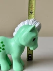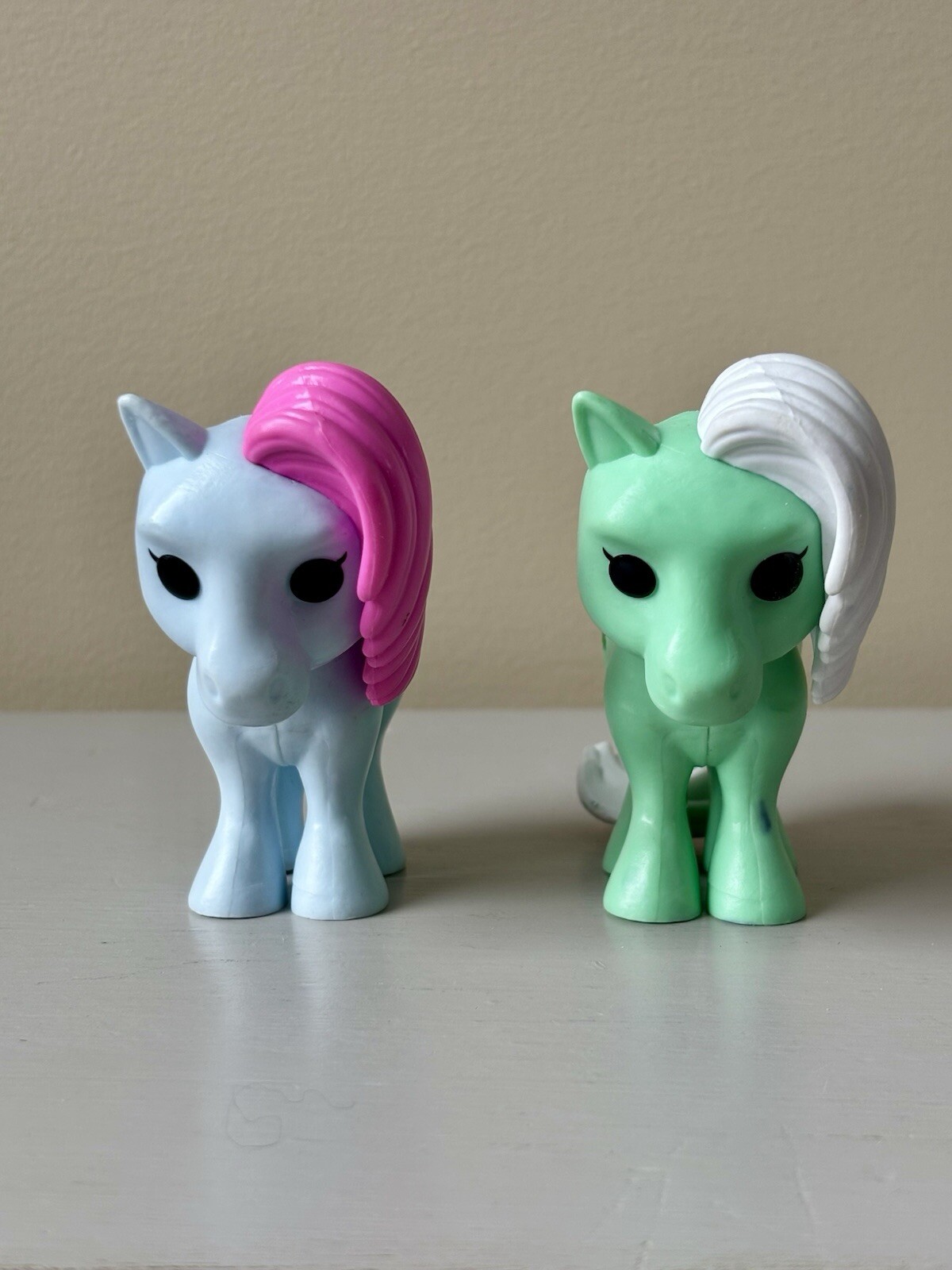 The product is a set of two Funko POP! vinyl figures featuring My Little Pony characters Minty and Blue Belle. Minty is identified as #62 and Blue Belle as #66, with Blue Belle noted as missing her tail. The figures stand at 3.5 inches tall and are part of a common rarity release from 2020. Both characters are depicted in shades of green and blue, staying true to their original My Little Pony designs from the franchise. The figures come without packaging and are a part of the modern Funko Pop product line.