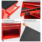 Features and Details: The metal storage cabinet comes with four wheels, two of which have parking brakes, so you can move the cabinet around freely or park in one place. The opening and closing of the drawers of the tool cabinet is very gentle thanks to the ball-bearing drawers. The storage surface provides additional space for storing and arranging tools you often need. The robust and powder-coated steel construction is used for high wear resistance. Specification: Material:Cold Rolled Steel Surface Finish:Powder Coating Casters:4" Casters (2PCS with brake and 2PCS without brake) Size :24.25*13*29.33 Package Size:28.86*27*15.18 Color:Red Weight (lbs.): 58.20