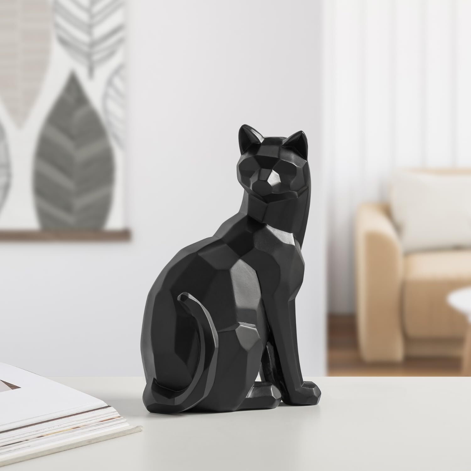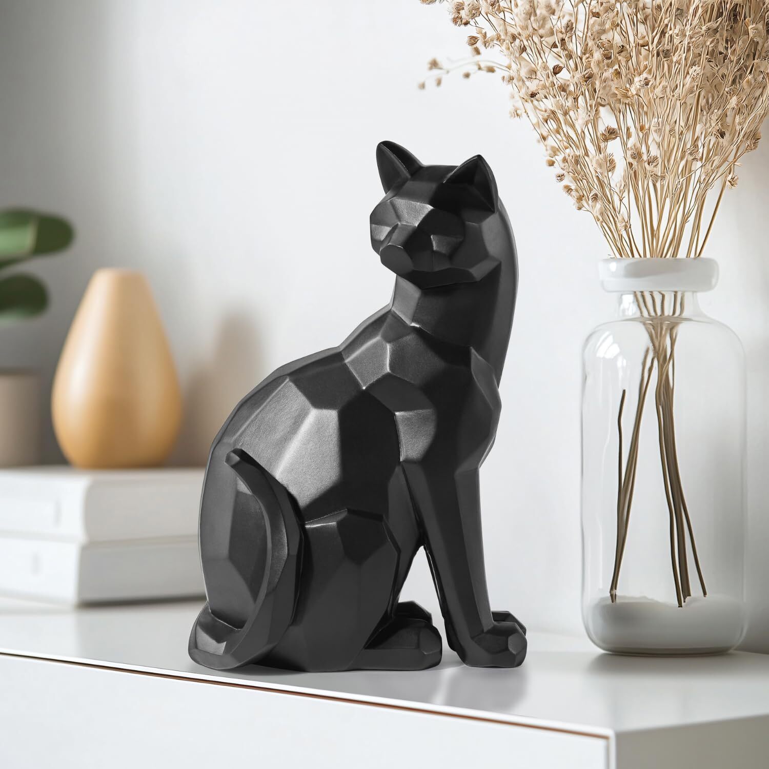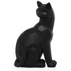 Black Carved Angle Sitting Cat- Our Carved Angle Collection, by , features a fusion of contemporary carved geometric shapes with charming cottage decor creating a spin on modern country. This series includes a rooster, horse, and cat, all available in both black and white. White cat measures 6.2 by 4.5 by 9.5 inches . specializes in sourcing the very best in clean, contemporary home decor and accessories from around the world. We create collections that reflect the newest trends in modern design and our style is synonymous with fresh, comfortable modern design in products that bring beauty to everyday living. Give your living space a lighthearted refresh with this geometric black cat figurine! With a modern, sleek design and a matte finish, this table-sized black cat sculpture can make itself at home regardless of your decorating style With its head turned to its back and a playful curve on its tail, this feline animal's whimsical posture radiates positive energy with a playful mood and friendly zen that we can all use in our spaces! This cute black cat decor will liven up your space whether it's placed in the living room, family room, bedroom, or kitchen! Sized to sit comfortably on a bookshelf, floating shelf, office desk, entryway console table, dresser, or windowsill! Give it some extra character by placing it around house plants, flower vases, table lamps, or other animal sculptures! Perfect Gift for Cat Lovers! This unique and charming midcentury themed décor will bring joy to your favorite friends and family members that love cats and house pets! Whether it's for a housewarming party, birthday, Christmas, or even in honor of losing a beloved cat or kitten, the abstract design of this house decor makes it a versatile accent for a variety of scenarios. This cat statue measures 6.25" W x 4.5"D x 9.5" H. Made by hand from high-quality resin with a semi-matte black finish