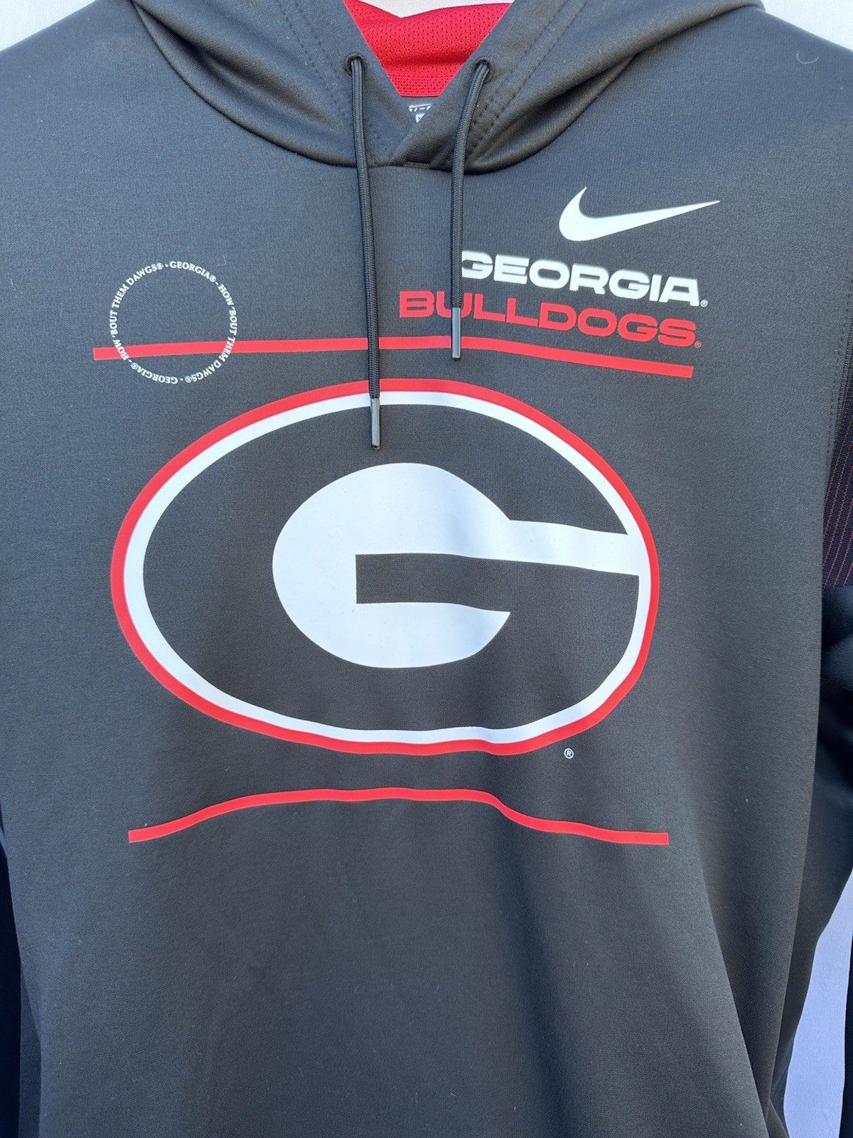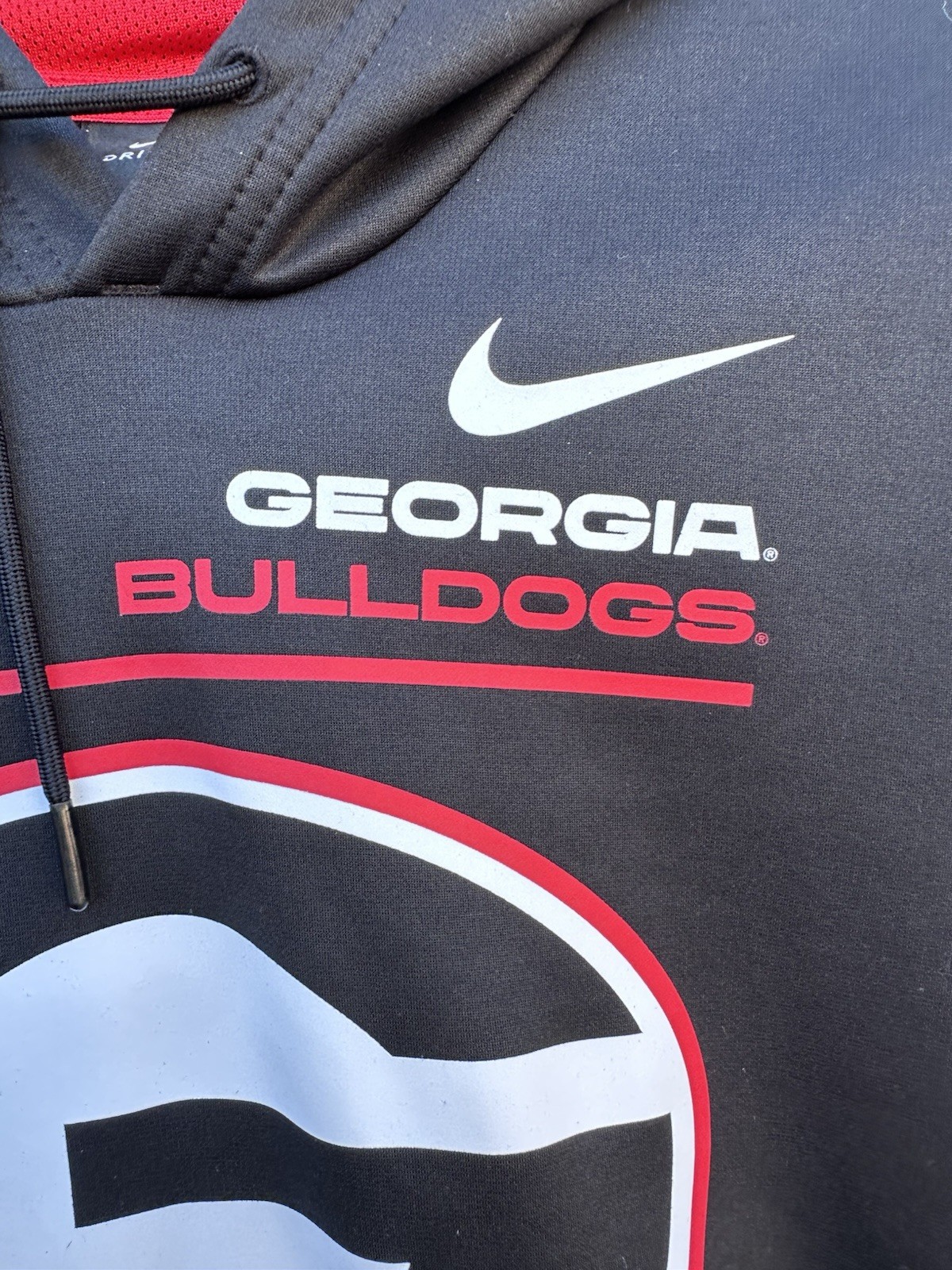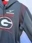 The product is a mens size XL black Georgia Bulldogs hoodie by Nike. This officially licensed NCAA football pullover is perfect for fans of the team looking to show their support during the regular season. Made with high-quality materials, this sweatshirt features the iconic team logo and is designed specifically for male fans of the Georgia Bulldogs. Ideal for game days or casual wear, this hoodie is a must-have for any avid fan of the team.