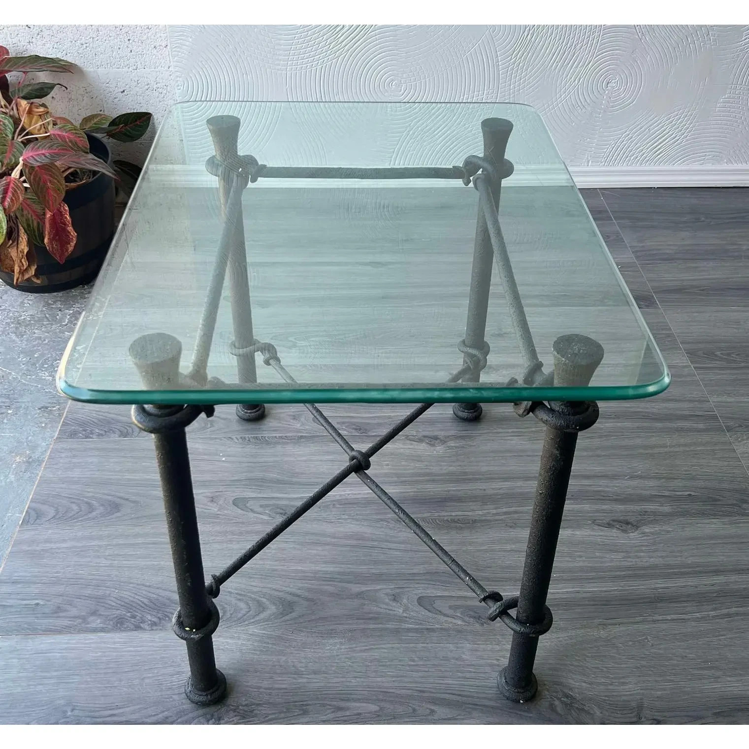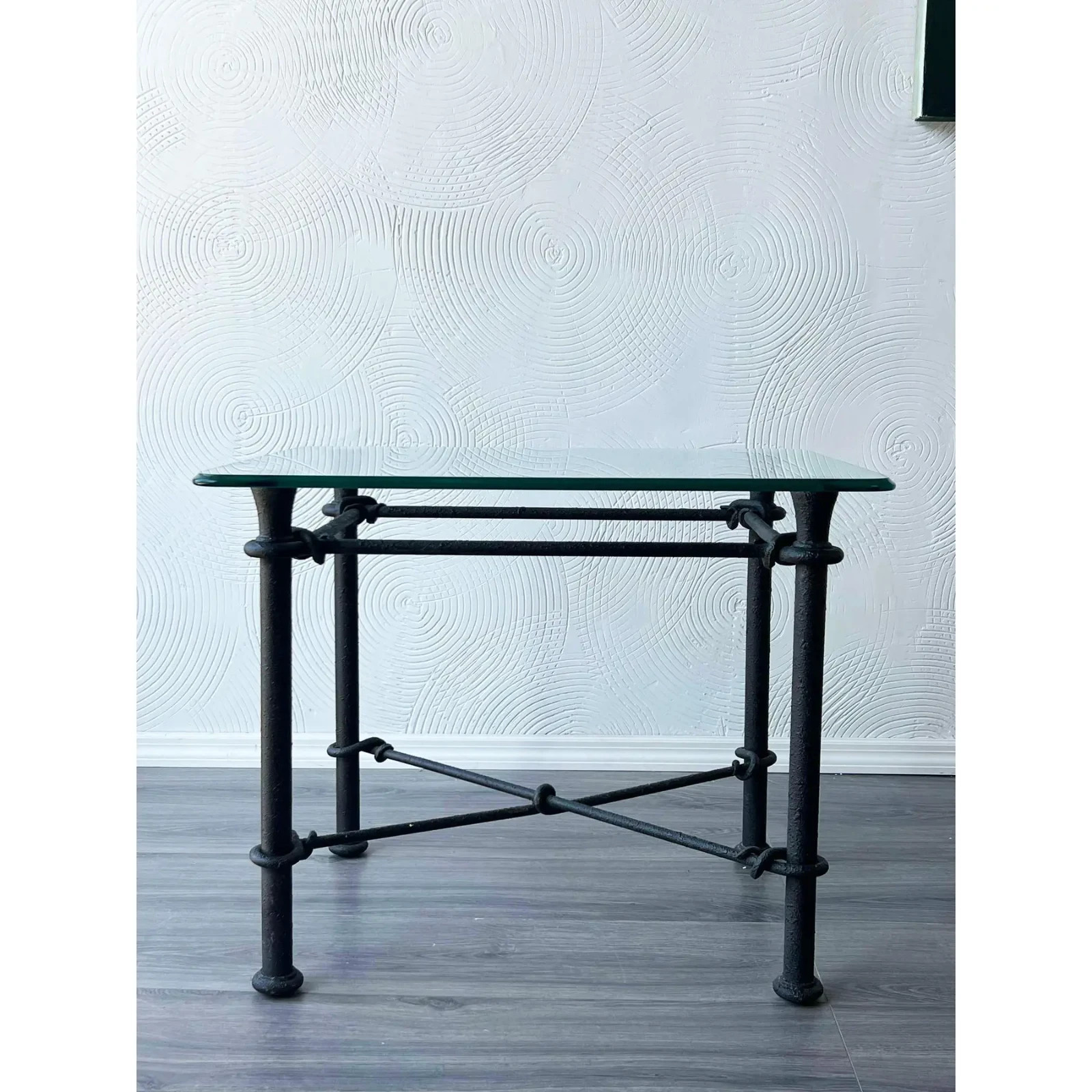 Vintage Giacometti style Iron side table with glass top Dimensions:38"Width x 22"Depth x 23"Height This table has minor wear and overall is great vintage condition See pictures and condition for reference If you have any question, please let us know, thank you Shipping is not included, shipping will be handled separated If you need assistance with shipping or shipping quotes, please let us know, thank you