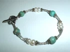 From Phoenix, Arizona, a girls bracelet of howlite turquoise, white pearls and white crystal spacer beads measuring 7" long. Has toggle clasp with a silver heart, condition is excellent. An excellent gift. We combine ship.
