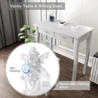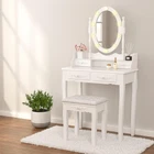 Product Description About this item Vanity Desk with 360° Rotating Mirror & Dimmer LED Lights— makeup vanity comes with 10pcs Hollywood Dimmer LED Light Bulbs, long press the switch to adjust the brightness, Energy-saving light can also be replaced if the lights does not work, more flexible than other vanities Dressing Desk with 4 Storage Drawers,4 drawers ( 2drawers on the desktop) and large tabletop of vanity makeup desk, give you enough space to store your cosmetics, jewelry, hair accessories, and other beauty supplies Made of Hardwood plus MDF, sturdy makeup table set,girls vanity set comes with Padded Cushioned stool 2-1 Design Wood Vanity, Detachable table top can convert the vanity as writing desk, Select Durable hardwood and MDF material for dressing table, sufficient stability and safety, wooden stool with soft sponge cushion, comfortable and max capacity: 220lbs Dimension:Table Size: 15.7"D x 31.5"W x 53.5"H; Stool Size: 15.1" L x 11" W x 17.8" H. Suitable for girls or women Shipping in 1 box , All needed parts, tools and easy-to-follow installation manual are included in one package, take about 30 min for green hand to assemble, girls can easily do it alone, 12-months free replacement parts Note: LED bulbs can be replaced, more flexible than others Girls White Makeup Vanity Set with Lighted Mirror and Stool Dressing Desk with Dimmer LED Light Bulbs 360° Oval Mirror with Detachable Design Vanity table top can be move away as a writing desk 360°Oval Mirror to meet different needs at multiple angles Lighted Mirror with stepless Led lights Long press the button to adjust the brightness to meet your different need Soft and bright lights to Light up your beauty LED bulbs can be replaced if the lights doesnot work, more flexible than others Previous page Next page