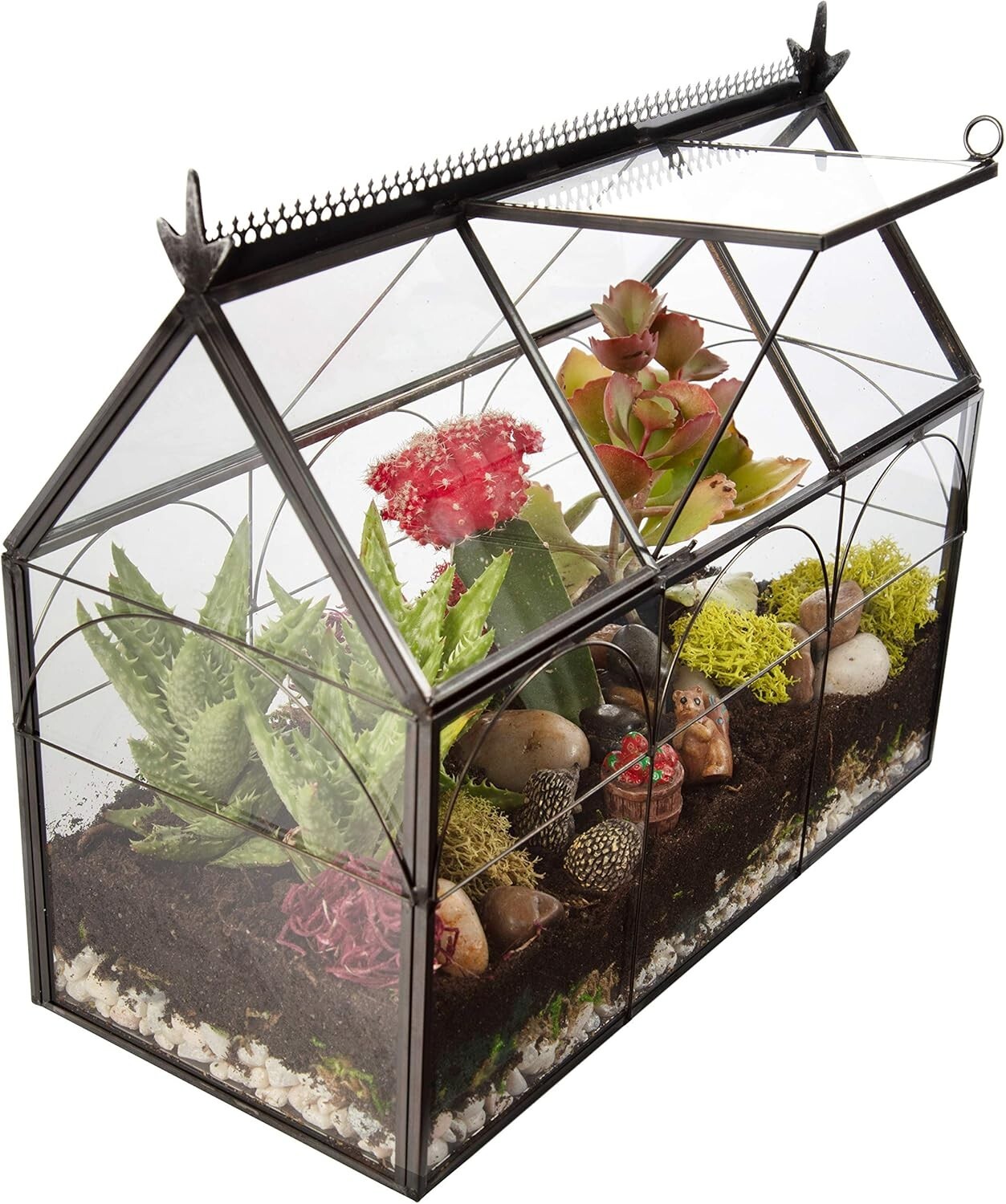 D’Eco Glass Greenhouse Shaped Plant Terrarium with Black Brass Accents. Comes fully assembled and measures 10” x 4.5 x 9” Beautiful Home Decor: Terrariums are amazing indoor tabletop displays of nature’s beauty. They serve as a decorative centerpiece to showcase succulents, air plants, micro greens, moss cacti, and more houseplants! Easy Plant Care: Our glass terrariums have a hinged panel opening for increased air flow ventilation and easy access to water or mist the plants inside. D’Eco terrariums make plant maintenance a breeze for beginners to seasoned gardeners Versatile Displays: Get creative and fill terrariums with an assortment of greens, flowers, special keepsakes and seasonal decor to brighten any space in your home, office, or garden! Perfect Gift Idea: Terrariums make great gifts for all occasions & holidays, especially for plant lovers! From birthdays, weddings, and housewarmings, to Mother’s Day and Christmas! NOTE: comes with only glass terrarium display, all plants and DIY terrarium kit supplies are sold separately