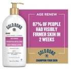 Product Description Gold Bond Ultimate Age Renew Strength & Resilience Skin Therapy Lotion, Unscented, 13 ounce (Pack Of 1) Strong skin is beautiful skin. Rejuvenate yours with Gold Bond Strength & Resilience Skin Therapy Lotion with proteins and lipids. Its unique formula has a blend of vital nutrients to help replenish moisture that is naturally lost from skin through the aging process. The seven moisturizers, stress response proteins, and lipids lock in moisture and nourish skin while the skin-firming complex of ingredients enhances skin's moisture. In fact, 87% of users reported visibly firmer skin in two weeks. What's more, Gold Bond Strength & Resilience Lotion is clinically-tested, hypoallergenic, fragrance-free, nongreasy, and fast-absorbing. DIRECTIONS: Apply daily to skin, reapplying as often as needed. Includes one (1) 13-oz. pump bottle of Gold Bond Strength & Resilience with proteins & lipids This Gold Bond Strength & Resilience Lotion has been tested by dermatologists and is hypoallergenic Create a TerraCycle account and start recycling your empty Gold Bond packaging This unique complex of ingredients helps replenish and nourish skin 87% of people had visibly firmer skin in two weeks Protein and lipid formula improves the texture of aging and mature skin Nine out of 10 people with diabetes saw noticeable skin improvement in one hour** Gold Bond Diabetics' Dry Skin Relief Lotion soothes dry skin with aloe and 3 nourishing vitamins Gold Bond Diabetics' Dry Skin Relief Lotion adds nourishing moisture for 24 hours Create a TerraCycle account and start recycling your empty Gold Bond packaging Hypoallergenic lotion is free from parabens, phthalates, dyes and fragrances Ingredients Water, Hydroxyethyl Urea, Glycerin, Dimethicone, Jojoba Esters, Petrolatum, Selaginella Lepidophylla Extract, Aloe Barbadensis Leaf Juice, Stearyl Alcohol, Behentrimonium Methosulfate, Glyceryl Stearate, Steareth-21, Ubiquinone, Whey Protein, Pyrus Malus (Apple) Fruit Extract, Citrullus Lanatus (Watermelon) Fruit Extract, Bisabolol, Cetearyl Alcohol, Stearamidopropyl PG-Dimonium Chloride Phosphate, Distearyldimonium Chloride, Cetyl Alcohol, Menthyl Gluceth-20, Tocopheryl Acetate, Panthenol, C12-15 Alkyl Benzoate, Magnesium Ascorbyl Phosphate, Sodium PCA, Sodium Lactate, Hydrolyzed Jojoba Esters, Polysorbate 60, Phytosteryl Macadamiate, Butylene Glycol, Jojoba Oil/Macadamia Seed Oil Esters, Potassium Hydroxide, Lens Esculenta (Lentil) Fruit Extract, Tocopherol, EDTA, Phytosterols, Methylparaben, Propylene Glycol, Squalene, Ethylhexylglycerin, Zingiber Officinale (Ginger) Root Extract Active Ingredients Hydroxyethyl Urea