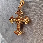 Gold Tone Cross Pendant with Blue / Purple Aurora Crystal Rhinestones Accents Gold tone cross pendant with aurora and amber rhinestone accents. Lobster clasp closure Approximate Measurements 18” full Length 2.5” extension 1.25” length x 1” width pendant Smoke Free | Pet Free Environment