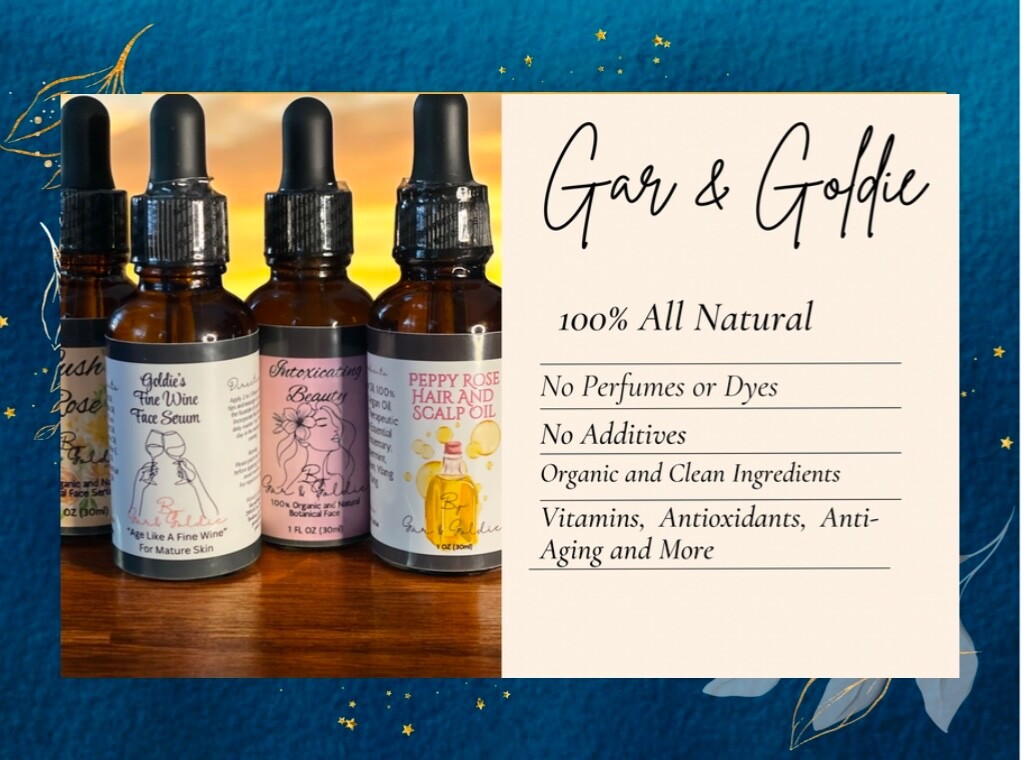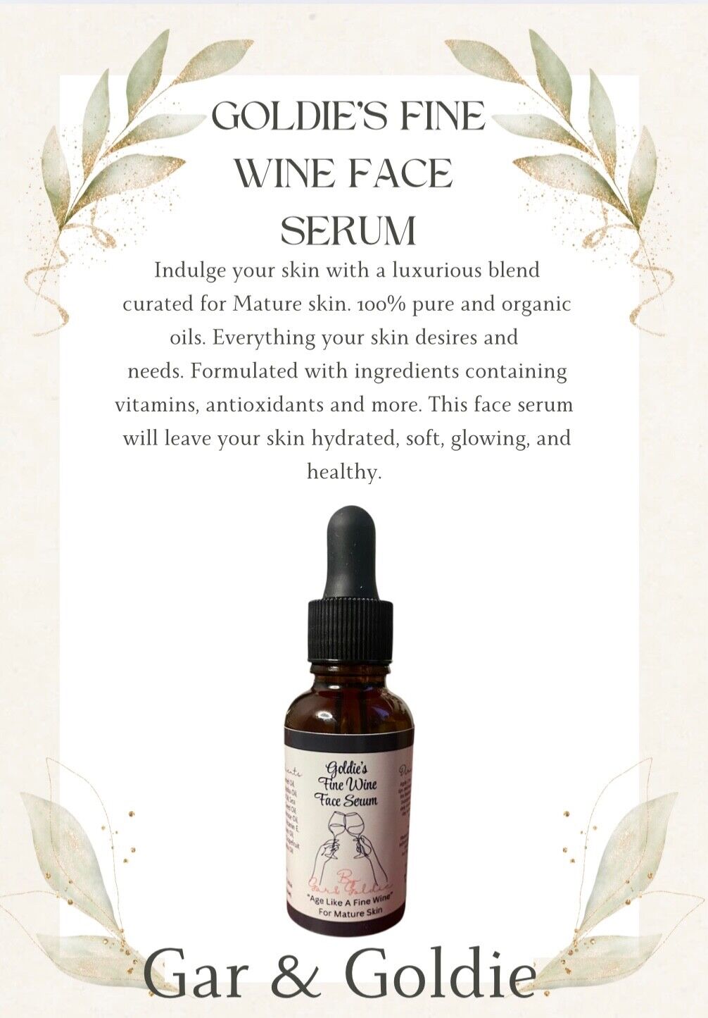 Goldie’s Fine Wine Face Serum for Mature Skin. Indulge your skin in a luxurious blend crafted specifically for aging skin care needs. Ingredients including Jojoba, Castor, Apricot Kernel, vitamin E, Rosehip, Rosemary, Frankincense and more. Perfect for daily use, this serum delivers targeted care of mature skin types, helping to maintain a refined and radiant complexion. This serum helps you embrace the beauty of aging gracefully.