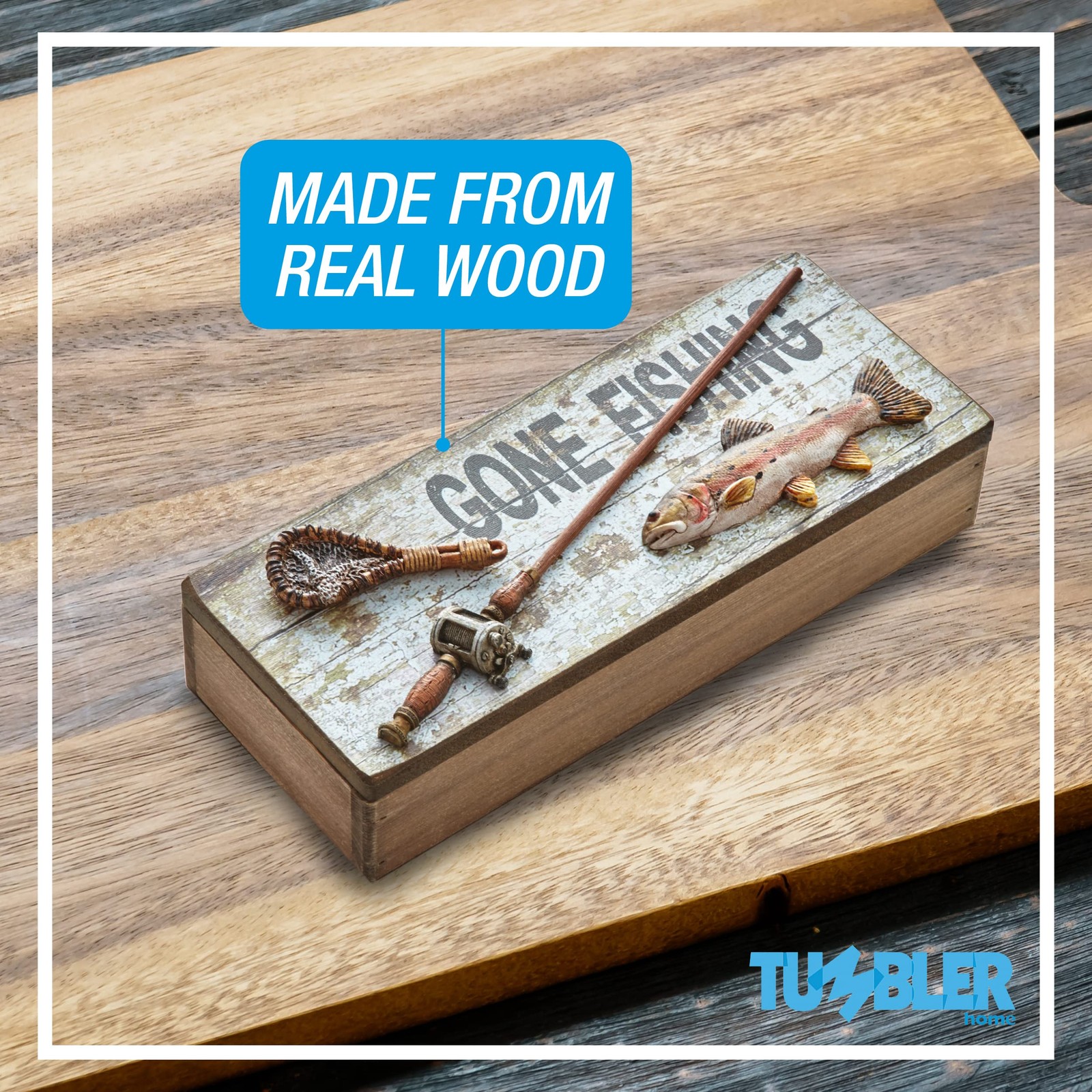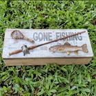 The Weathered Gone Fishing is the perfect place to empty your pockets at the end of the day - wallet, change, keys, or jewelry. The is cleverly embellished with a fishing rod, fish net and a resin fish and is a generous size - 9.75"x4"x2.5". An excellent iIdea for Father's Day, , Christmas or any gift giving occasion. Perfect to hold a gift card, cash or even a small present. Weathered Gone Fishing is the perfect place to empty your pockets at the end of the day - wallet, change, keys, or jewelry Generous size - 9.75"x4"x2.5" Cleverly embellished with a fishing rod, fish net and a resin fish An excellent iIdea for Father's Day, , Christmas or any gift giving occasion Perfect to hold a gift card, cash or even a small present.