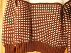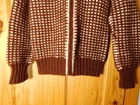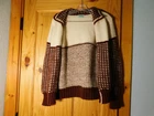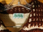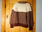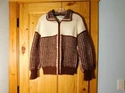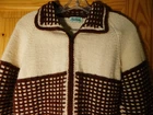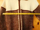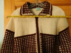 Very nice vintage sweater. The tag reads made with love by grandma. I believe it to be handmade and knit. It is off white with brown and has a unique square pattern knitted onto it. The sweater is heavy duty and thick, and the material feels a little rough like it has some wool in it. It fits a size small woman (105 lb) perfectly and I have included measurements in the pictures. There is a loose thread near the top and is pictured up close. Please see all pics for full condition. Thank you for looking.
