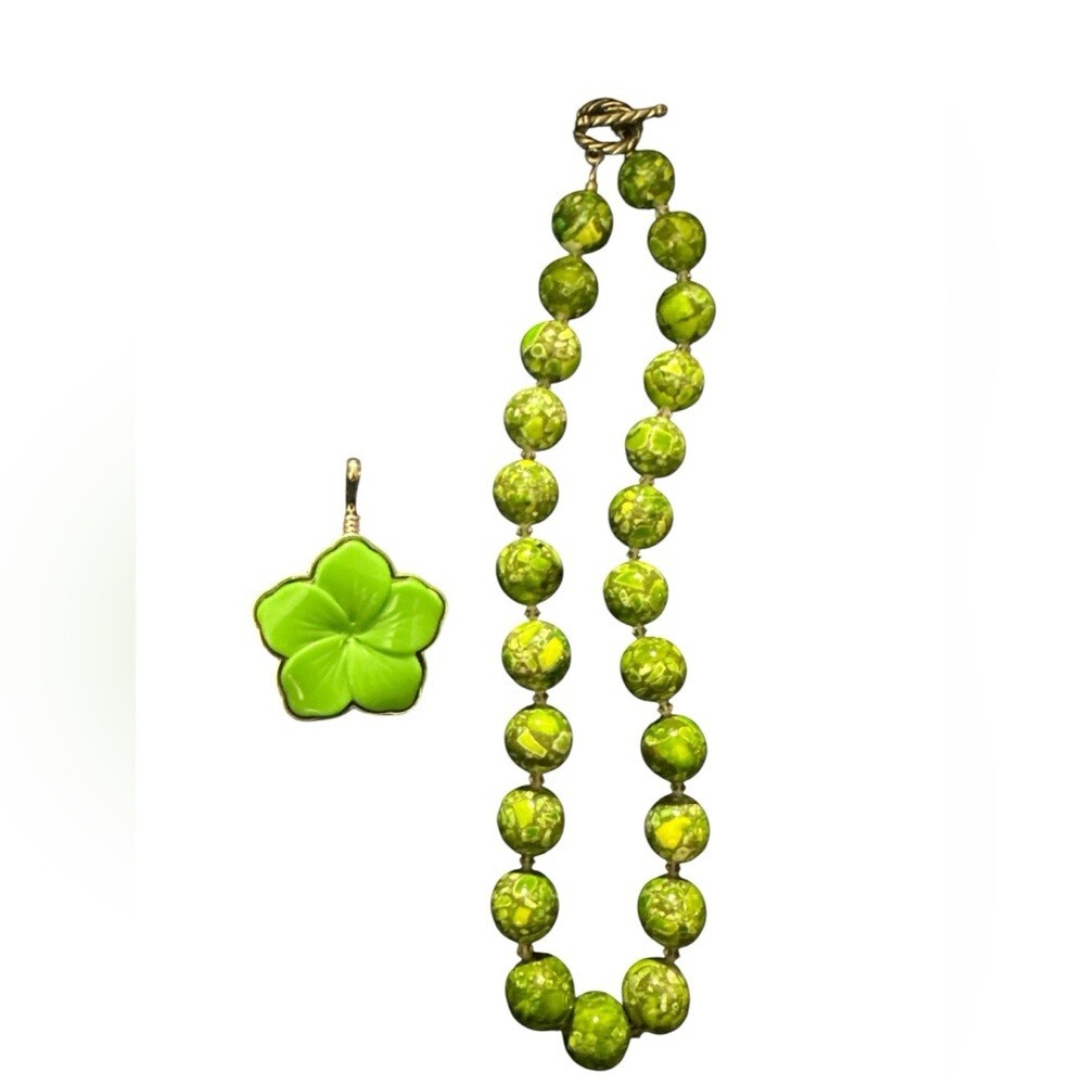 Green speckle beaded necklaces with detachable flower pendant silver clasp