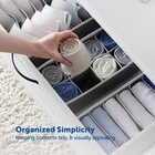 Dresser Organizer, [4 Pk] Grey Fabric Dresser Drawer Organizers (4 Sizes With 45 Slots) Foldable Underwear Drawer Organizer Breathable Bins for Bra, Lingerie, Socks, Scarves, Belt, Tie, Baby Clothes. Description and features CLOSET ORGANIZATION - 4 sectional underwear drawer organizers keep your drawers orderly, make doing laundry simpler, and allow you to grab what you need without sorting through jumbled messes. MULTIPLE SIZES - The set includes 4 drawer organizers for clothing. One with 6 cells ideal for scarves and belts, a 7-cell to store bras, t-shirts and underwear, a 8-cell great for panties and knee socks, and a 24-cell for lower-cut socks and tie storage. EASY SET UP - The underwear and sock organizers just have to be popped open—no tools required—to be ready for use. When not in use, they fold flat for compact storage. QUALITY CONSTRUCTION - Crafted of durable, breathable canvas with high-quality zippers and reinforced edging, invest in panty, bra, tie, and sock storage bins that are designed to last a long time. PLEASANT AESTHETIC - Fill your drawers with matching bins with a neat, homey appearance. The bra organizers stay upright without sagging or collapsing, granting your space a prim look. MEASUREMENTS: - The 2 bigger pieces are 12" x 12" inches. The 2 smaller pieces are 6" x 12" inches. The height is 4.5" Inches. CLOSET ORGANIZATION - 4 sectional underwear drawer organizers keep your drawers orderly, make doing laundry simpler, and allow you to grab what you need without sorting through jumbled messes. Return Policy ⦿ All our products come with a 30-Day Return Policy. If you would like to return your item and you are within 30 days of the purchase, and it is still in its original condition, you can return the item by contacting us through eBay messaging. ⦿ If you are not 100% satisfied, please let us know the Detailed Problem,We will give you a 100% satisfactory solution ⦿ If you received an incorrect, damaged, defective, or item not as described, contact us for a partial/full refund or replacement on our cost. ⦿ Free Shipping and Free Return 30-Days Money Back Guarantee. ☎ For all returned products, buyers MUST contact us for the returning address. Shipping ⦿ We do not ship to a different address. we will ship to the address you provide on the ebay only. Please check your address before purchase. ⦿ It should take 2-4 business days for the product to reach your destination. ⦿ If the product doesn't reach your destination within the time limit, please give it an additional 1-2 business days in case of postal delays and/or possible technical issues. ⦿ We use a selection of shipping services such as UPS, FedEx, USPS etc. ⦿ We ship only to the 48 contiguous states of America. We do not ship to Hawaii, Alaska, US Protectorates, APO/FPO addresses. Local pickups are not offered. ☎ If it takes any longer than that, please do not hesitate to contact us to resolve the issues. Contact us ☎ Please contact us via eBay message. And your message will be replied within 1 business days. For any queries, please feel free to contact us, we will get back to you as quickly as possible. Customer 100% satisfaction is our first priority and goal. We are always working hard for maintain high standards of excellence and resolve your problem in best way. So your POSITIVE FEEDBACK is very important. If you have any problem of the item, please feel free to let us know before leaving your feedback. We will try our best to solve your problem. About us We are here to give you quality products, competitive pricing and amazing service in order to make sure you get the best deal online, Thank you for your business and the opportunity to serve you.