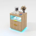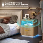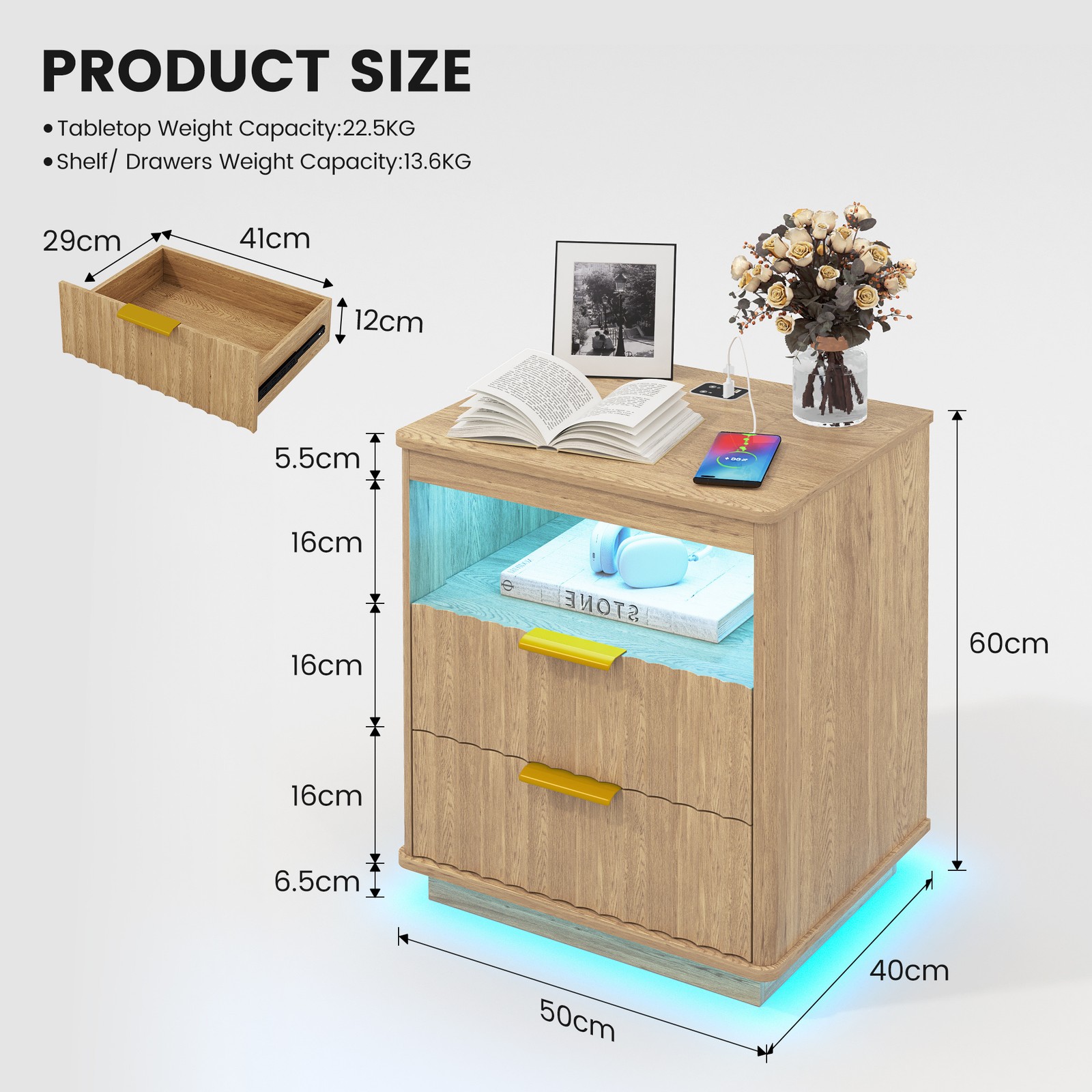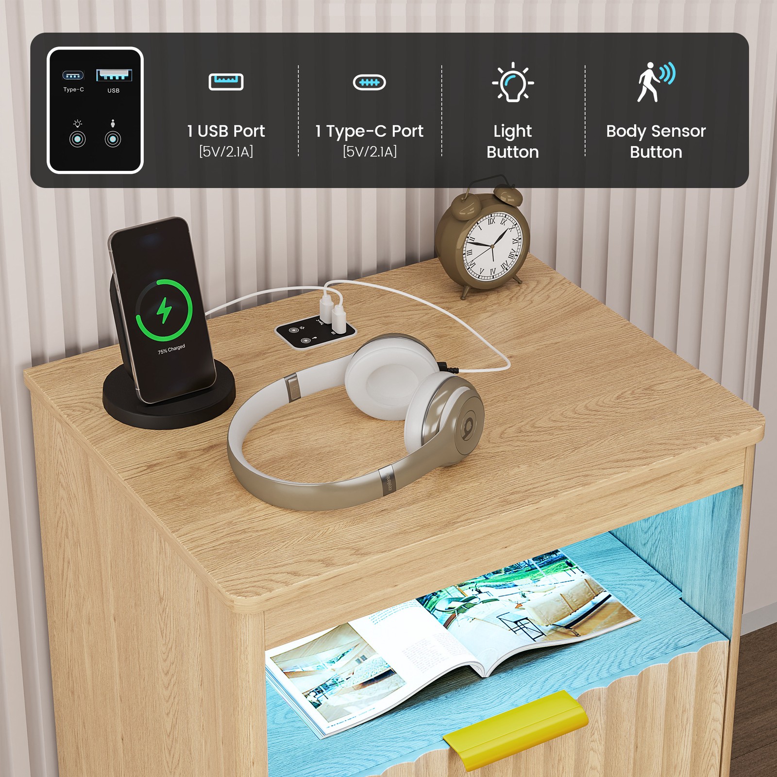 Smart LED Light Bedside Table:This night stand features 3 light colors: ice blue, yellow, and white. Short press to switch colors; Long press to adjust brightness. You could switch colors to suit your different needs, creating distinct room atmospheres Modern Nightstand with Charger Station: Built-in charging module with USB port and Type-C charging port. The dual-port design ensures users can find the right charging port for any device—whether it's a phone, ipad, or laptop—without needing additional adapters Human Body Detection System: The light automatically turns on when someone approaches the night stand and turns off when they leave. No need to search for switches in the dark—This bed side table keeps you safe. Precise time control saves you power Ample Storage Space: Nightstands with 2 drawers and open storage, providing ample space for organizing various items. Organizing your belongings not only enhances the tidiness of your surroundings but also helps maintain a pleasant mood Easy to Assemble: The end side table provides detailed assembly instructions and assembly tools. Please contact us first if you encounter any problem, we will solve the problem for you at the first time Our product frames are all made of FSC-certified wood Bedside tables for different scenarios Modern smart bedside tables with LED light