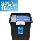 Product details The HART 12 Gallon Heavy Duty Latching Plastic Storage Bin Container, Black base/Blue Lid, Set of 1 provides you with an easy storage and organization solution to reduce clutter and increase space in your home. Made of extremely durable plastic (polypropylene), the fluted rigid walls of these storage bins are designed to be strong and stackable to maximize storage space and to stay stable when stacked. The recessed lid design helps keep these storage containers secure and prevent tipping. The two tough latching white grip handles make it easy to transport or use for moving valuable around while keeping items secure. The compact 12-gallon size is great when needing to store heavier items or on higher shelfs. For added measure, the storage tote includes 4 large holes around the edge to keep items safe using zip-ties or padlocks. Durable and Heavy-Duty black resin construction resists rust, dents, stains and peeling to ensure lasting use while protecting against pest, dust, pollen, and weather Stackable and Recessed lid design creates stability and reduce toppling when multiple units are stacked Latching Handles and Easy to open and close 2-point grip latch handles keep your items safes from spilling or falling out Lockable Lid: Lid comes with 4 holes ideal for zip-ties or large enough for padlocks to keep your items safe and secure Exterior Dimensions - 15.3 IN W x 22.7 IN D x 13.3 IN H OR (39.3 cm x 57.6 cm x 33.7 cm) Easy to clean surface, Indoor or Outdoor use Sustainable - Made from recycled materials Set of 1: Includes 1 black base and 1 blue lid Storage Ideas: Gardening supplies, Pet treats and supplies, Cleaning and household products, Holiday and seasonal items, Linens, Clothing, Shoes, Handbags, Toys, Games, Arts and Crafting supplies, Kitchen items that are easily breakable, Underneath cabinets, In smaller or hard to reach space like attics, basement, and pantries Collection: HART Heavy-Duty Latching Black and Blue Storage Totes comes in additional sizes such as 5 Gallon, 12 Gallon, 17 Gallon, 27 Gallon, 40 Gallons and 50 Gallons On Jul 10, 2025 at 23:35:26 PDT, seller added the following information: