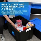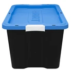 Product details The HART HART 27 Gallon Heavy Duty Latching Plastic Storage Bin Container, Black Base/Blue Lid, provides you with an easy storage and organization solution to reduce clutter and increase space in your home. Made of extremely durable plastic (polypropylene), the strong rigid walls of these storage bins are stackable to maximize storage space and to stay sturdy when stacked. The recessed lid design helps keep the storage containers secure and prevent tipping. The two latch grip handles make it easy to transport or use for moving valuable around. The large 27-gallon size is great when needing to store larger and bulkier items. For added measure, the storage tote includes 6 large holes around the edge to keep items safe using zip-ties or padlocks. Durable and Heavy-Duty black resin construction resists rust, dents, stains and peeling to ensure lasting use while protecting against pest, dust, pollen, and weather Stackable and Recessed lid design creates stability and reduce toppling when multiple storage bins are stacked Latching Handles: Easy to open and close 2-point grip latch handles keep your items safes from spilling or falling out Lockable Lid: Lid comes with 6 holes ideal for zip-ties or large enough for padlocks to keep your items safe and secure Tie Down Grooves: Lid has molded indents for tie down straps to keep tote secure during transportation Exterior Dimensions - 28.9 IN W x 20.5 IN D x 16.5 IN H OR (73.4 cm x 52 cm x 41.9 cm) Reusable, Easy to clean surface, Indoor or Outdoor use Sustainable - Made from recycled materials Includes 1 black base and 1 blue lid Storage Ideas: Gardening supplies, Pet treats and supplies, Cleaning and household products, Holiday and seasonal items, Linens, Clothing, Shoes, Handbags, Toys, Games, Arts and Crafting supplies, Kitchen items that are easily breakable, Underneath cabinets, attics, basement, and pantries