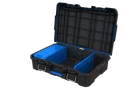 Are you looking for a power tool case that offers custom protection for your power tools or hand tools: Hart knows better than anyone that power tools and hand tools come in all shapes and sizes. The Hart suitcase style tool box with the blue tool and parts organizer can be customized by adding foam filling inside the case to match the exact shape of your specific parts, tools, blades, markers, brushes, paints, or whatever else you want held in place (foam not included). Keeping your tools in great shape has never been more personal! Hart Stack System Power Tool Case with Small Tool Blue Internal Case with Blue Dividers, Mobile Tool Storage and Organization, Black with Blue Accents Features: Ideal case for weekend warriors, home DIY-ers and serious crafters Serves as a Power Tool Case, and allows you to customize foam filling for your specific power tools or accessories (Note: foam is not included in the product) Ergonomic carry handle for convenient portability IP54 seal protects your tools from dust, moisture, and accidental contact with water – making it ideal for outdoor use Durable plastic construction defends contents from dings and knocks Metal latches securely fasten the case at all times, especially when you're on the move The HART Power Tool Case has an opening for you to insert a padlock keeping your belongings safe from theft (lock not included) Internal blue small tool organizer case and dividers keep your hardware and small tools handy. Keep your small parts tidy & handy with a movable organizer case & 2 dividers included. The organizer can either be clipped inside for internal storage or stacked on top of the case for easy access. Can be easily stacked onto any of the storage units within the HART Stack System Load Capacity - 47.5 LBS
