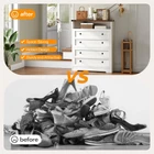 About this item Farmhouse-Style Shoe Cabinet with Flip Drawers: This shoe cabinet features a pure white body and a walnut-colored top panel to create a modern aesthetic that effortlessly complements any decor. Its unique metal trim elevates the entrance's charm Space-Saving Design: Measuring 31.5"L x 9.4"W x 43.3"H, this hidden narrow shoes storage cabinet boasts a flip-up design that fits into narrow spaces like behind doors and hallways to meet your storage needs. Close the flip drawers when not in use, keeping your hallway tidy Large-Capacity Storage: The shoe cabinet storage for entryway can hold 12-16 pairs of shoes. Each drawer has an adjustable shelf that can be adjusted or removed to fit various-sized shoes. The open compartment stores frequently used items like bags and keys Sturdy Shoe Cabinet: Crafted from premium particleboard and MDF with fine craftsmanship, this farmhouse slim shoe cabinet ensures robust stability and the top can withstand 110 lb. Anti-tip devices are included to secure the cabinet to the wall to prevent tipping Specifications: Color: White, Walnut Material: Particleboard, Metal Product Size: 31.5"L x 9.4"W x 43.3"H Weight: 44.9 lb Package Contents: 1 x Shoe Storage Cabinet; 1 x Anti-Tip Kit; 1 x Accessory Kit; 1 x Instructions
