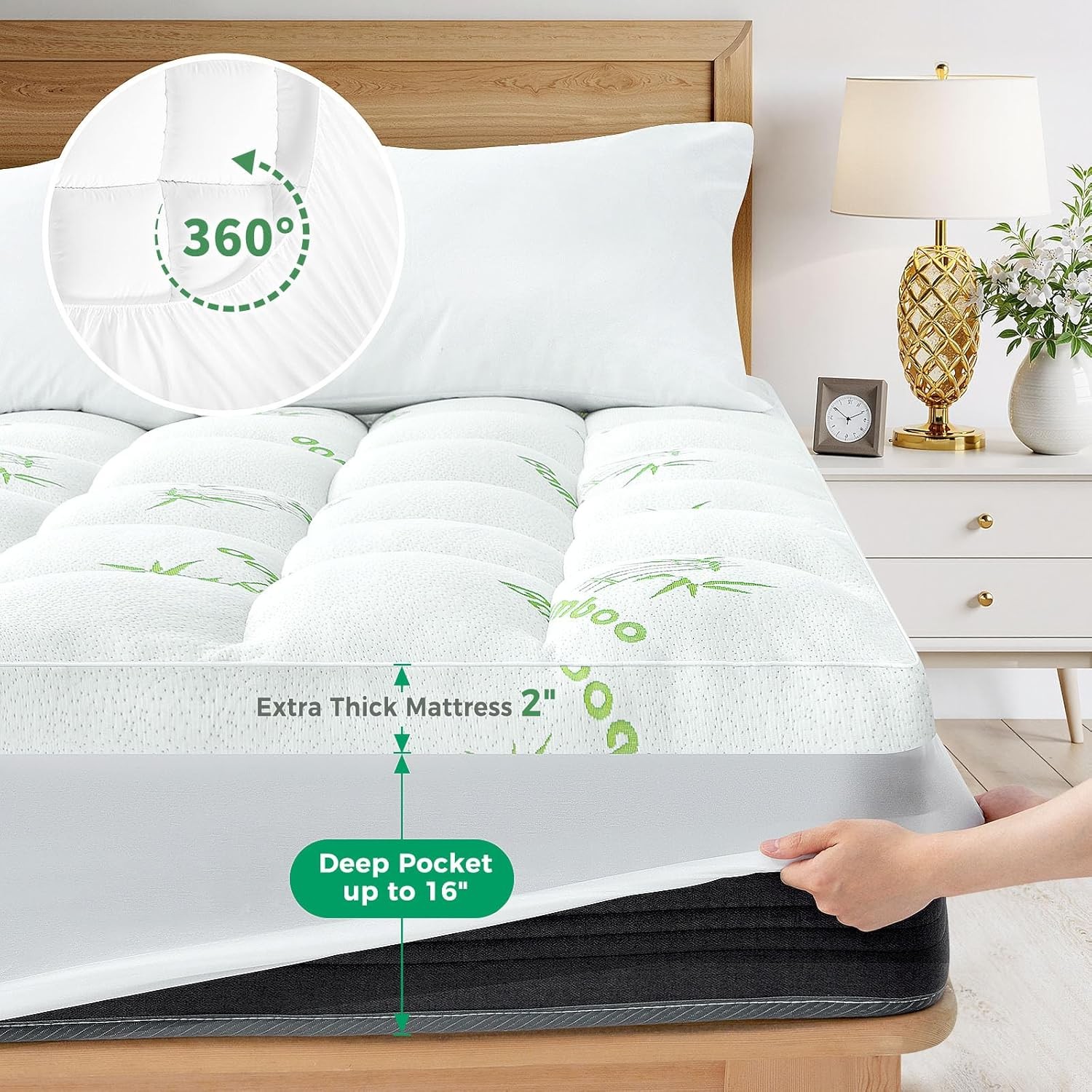 NUVOLETA Queen Mattress Topper - 100% Viscose Bamboo Cooling Cover in White