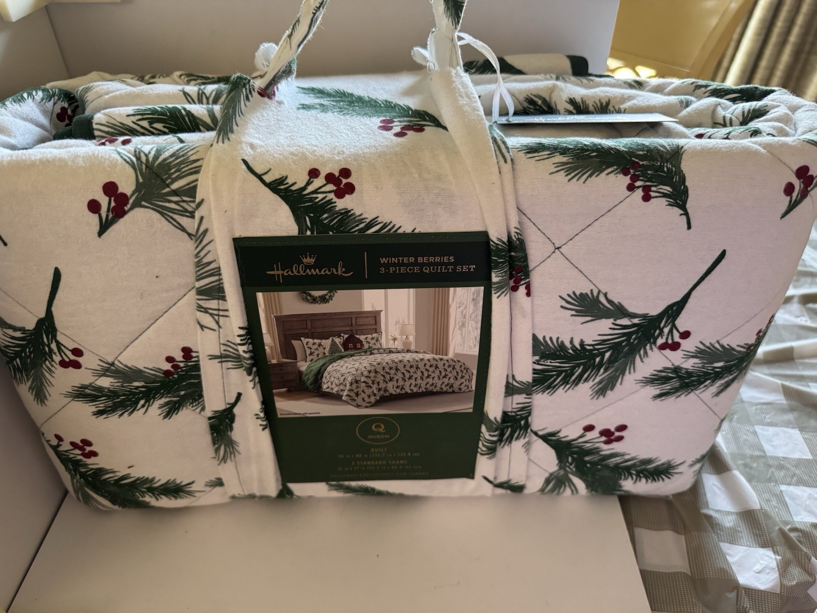 The Hallmark Winter Berries Queen 3-Piece Quilt Set is a charming addition to any bedroom, featuring a floral holiday theme in white, green, and red colors. Made from 100% cotton with a 100% polyester fill, this rectangular quilt set is machine washable for easy care. The quilt set includes a quilt and two pillow shams, all with a quilted finish and measuring 92 inches in length and 88 inches in width. Perfect for adults, this set brings a touch of nature and holiday cheer to any bedroom during the festive season.