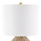 About This Product This woven table lamp with a rotary switch highlights both coastal and bohemian designs. At 20 in. tall, our rattan table lamp is the perfect addition to any entryway or living room. Its lightly colored cotton shade complements the rattan base, adding a traditional yet rustic touch to any space. Traditional brown woven base with a white cotton drum shade and brass gold accents Brass gold rotary switch, this lamp adds a classic touch to any space Bohemian touches include not just the rattan woven lamp base but also the traditional cotton shade Includes an elegant, clear, plastic cord of 60 in. L Complement the room with the glorious gold interior harp and finial behind the lampshade Compatible with the maximum wattage of a type a 100-Watt or LED 16-Watt bulb Drum-shaped cotton fabric shade with a gourd-like rattan body